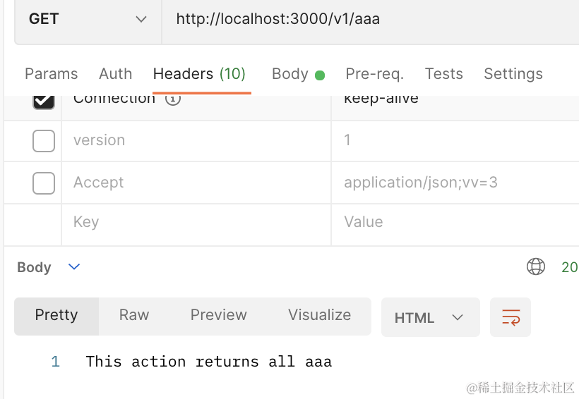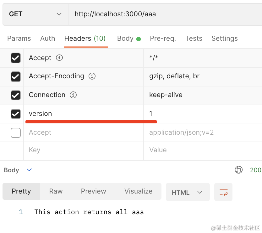 可以看到,带上 version:1 的 header,访问的就是版本 1 的接口。