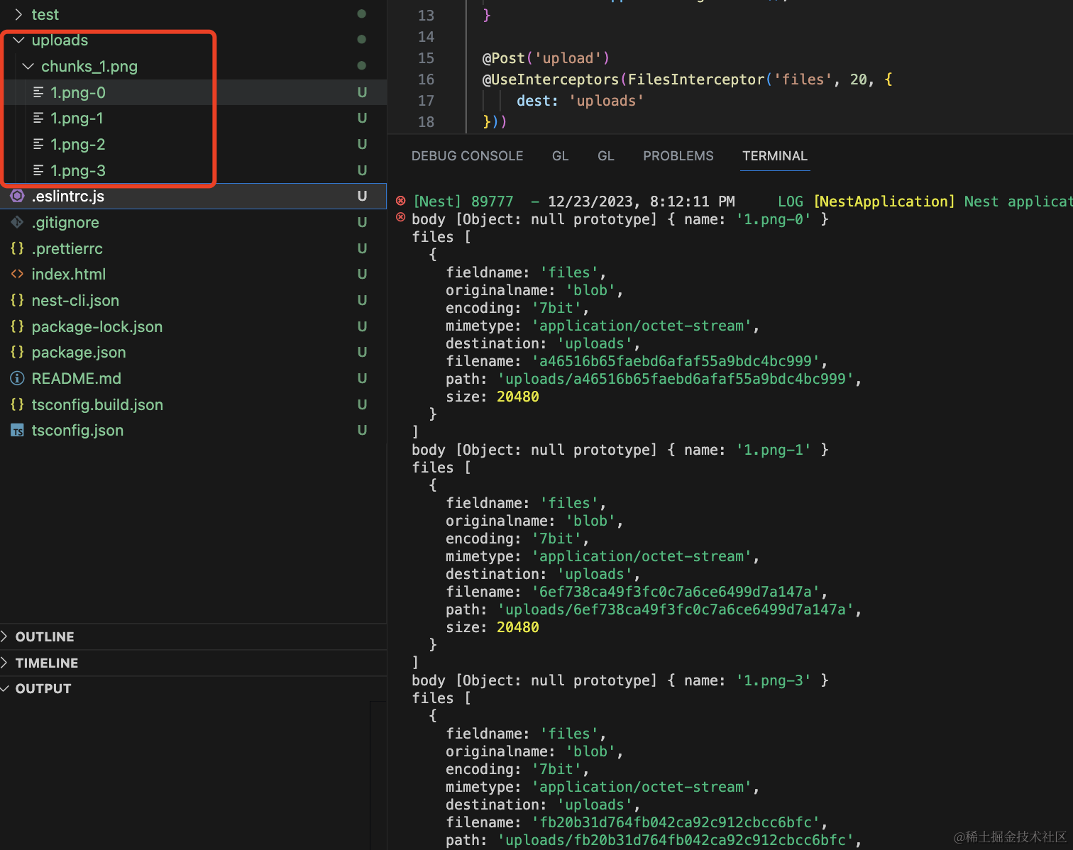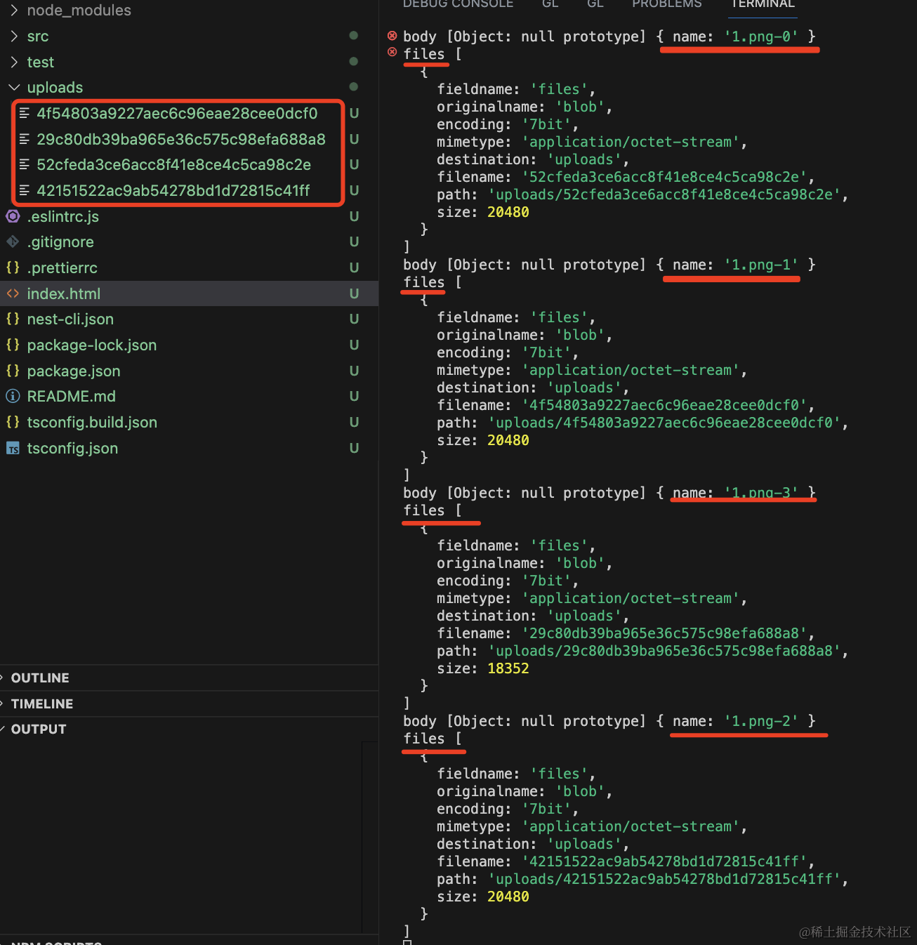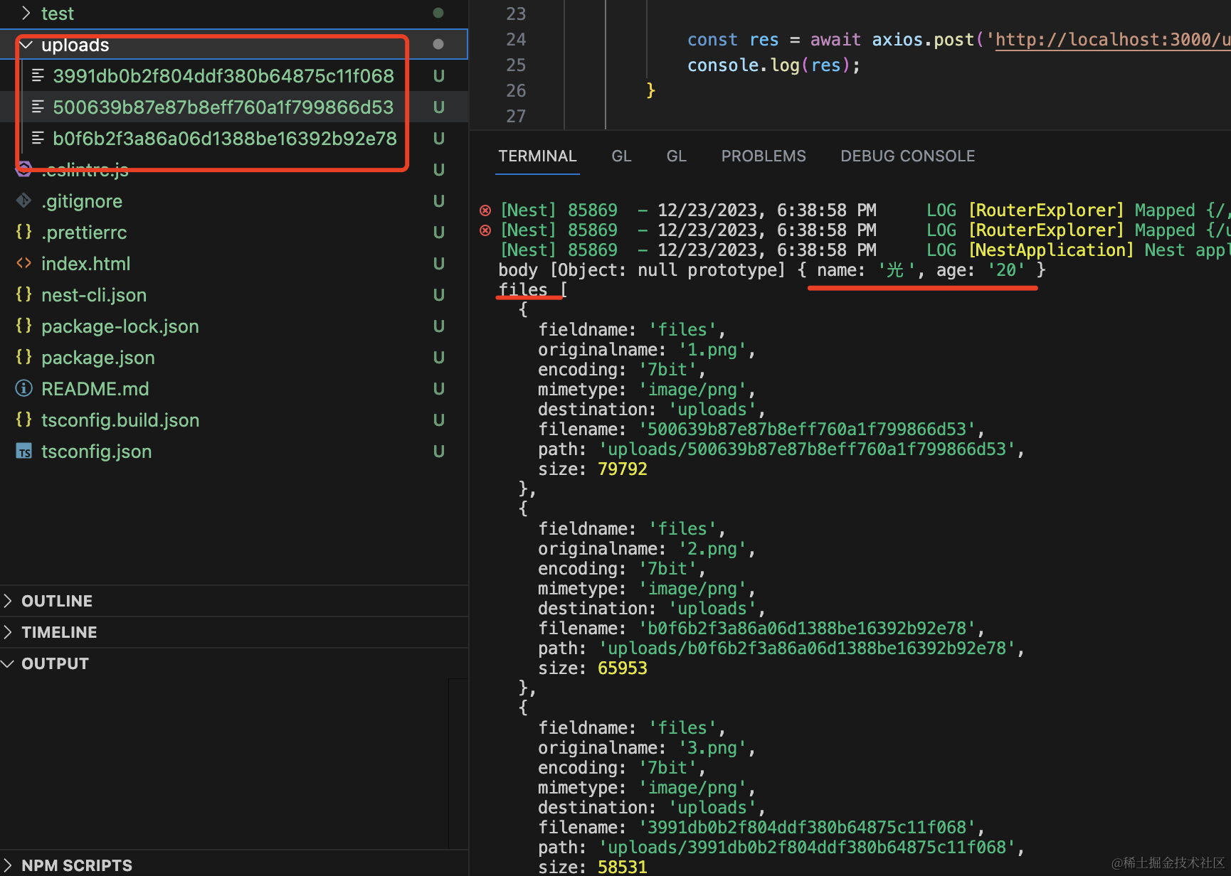 这时候,Nest 服务端就接收到了上传的文件和其他字段: