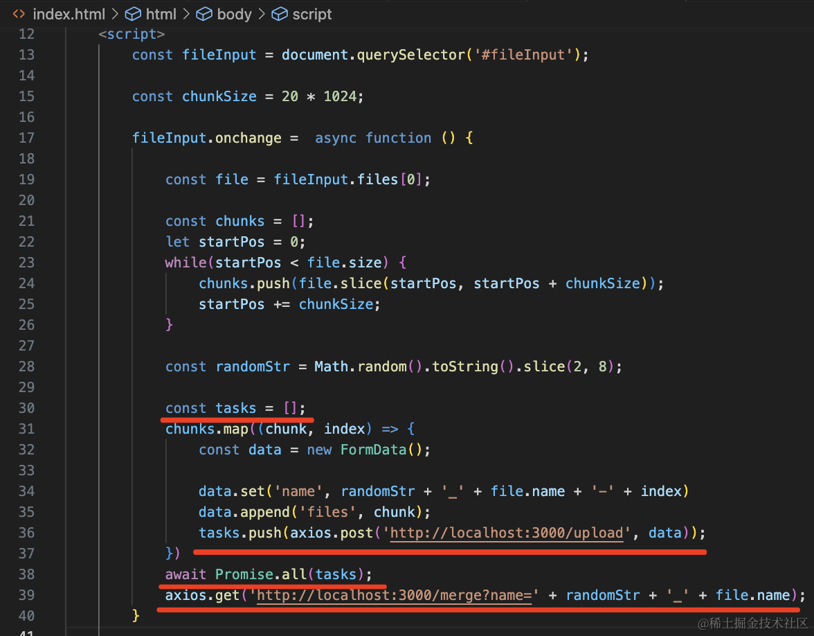 </html>对拿到的文件进行分片,然后单独上传每个分片,分片名字为文件名 + index。