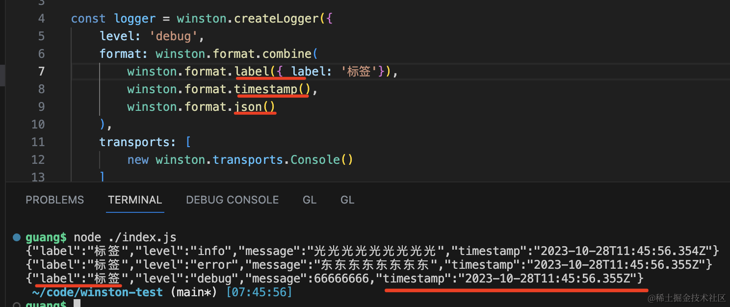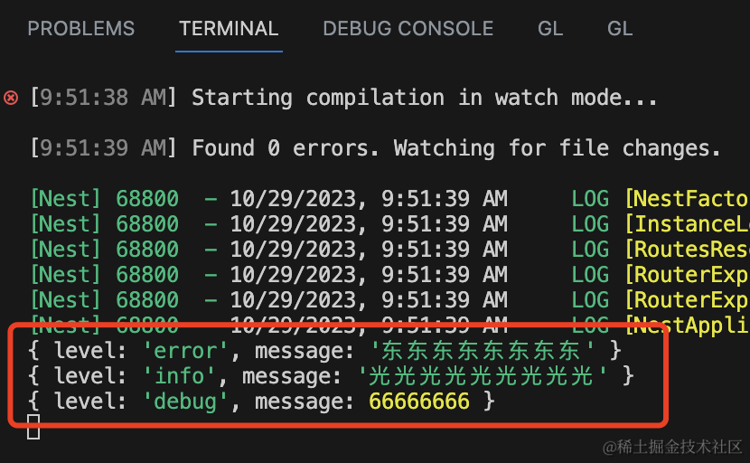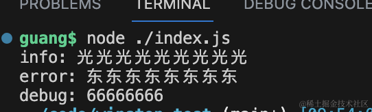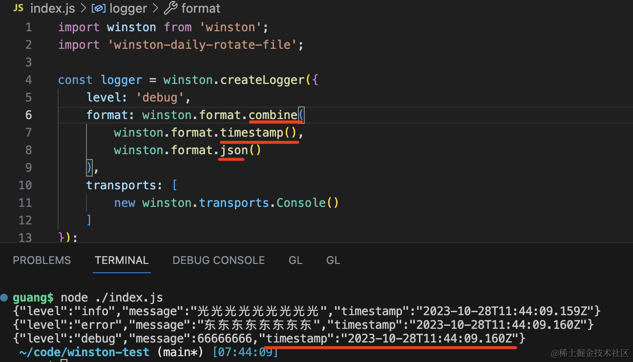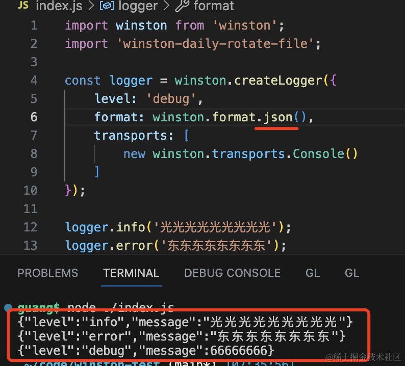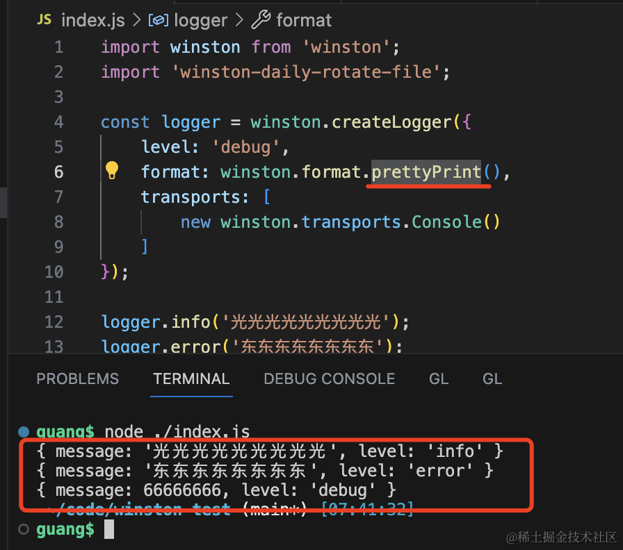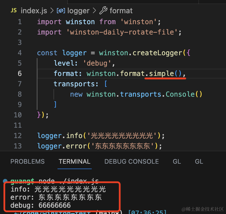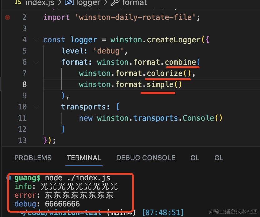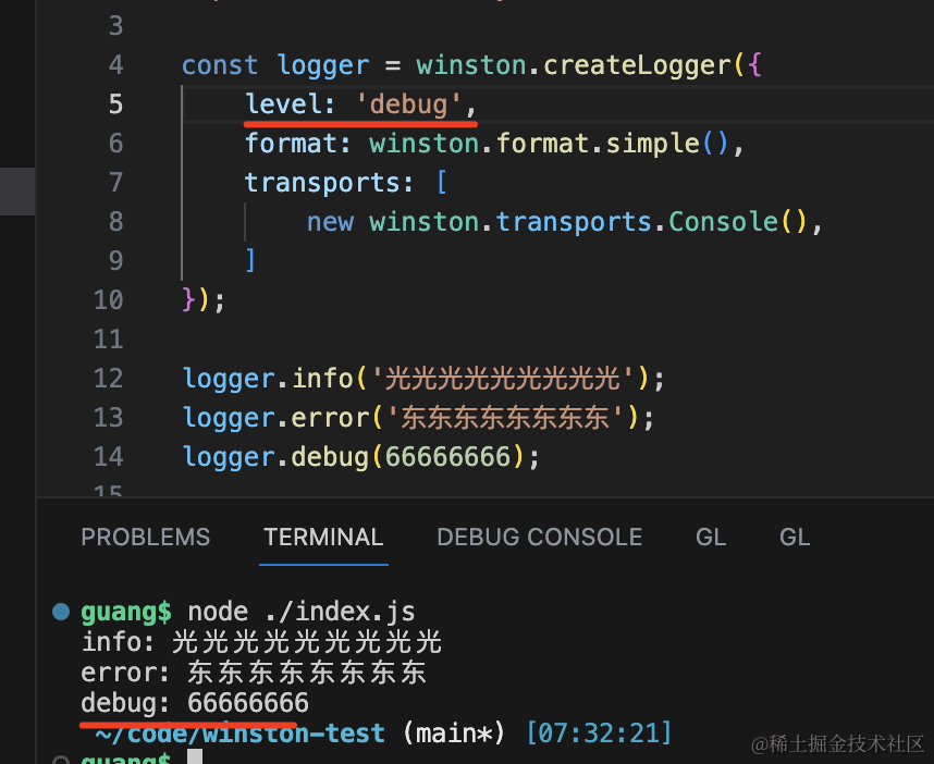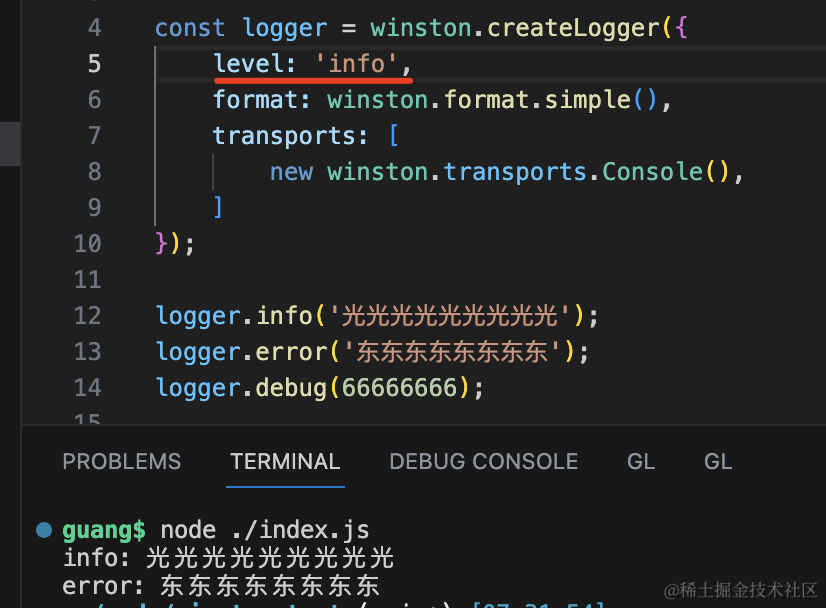 logger.debug(66666666);用 createLogger 创建了 logger 实例,指定 level、format、tranports。