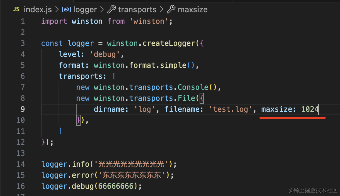 logger.debug(66666666);这里使用了 DailyRotateFile 的 transport,然后指定了文件名和日期格式。