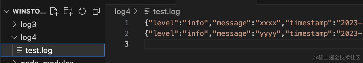 logger2.info('yyyy');我们创建了 2 个 logger 实例,其中一个只写入 console,另一个只写入 file,并且 format 都不同。