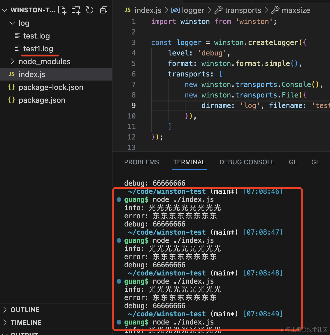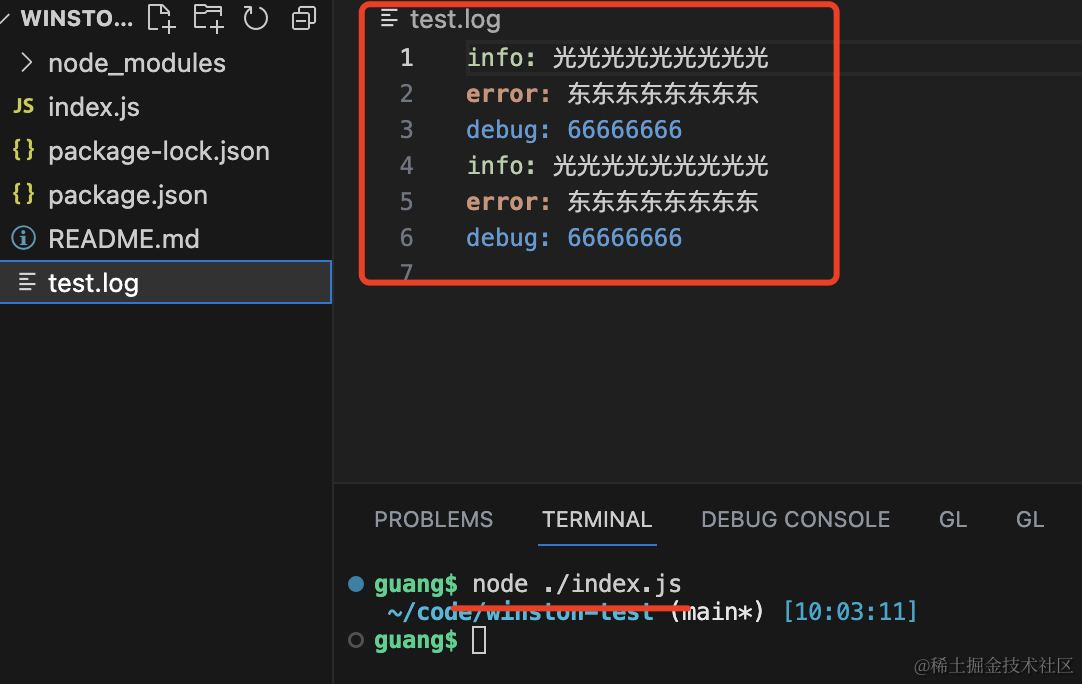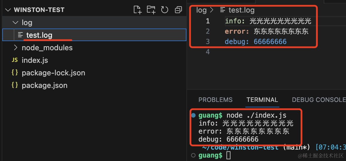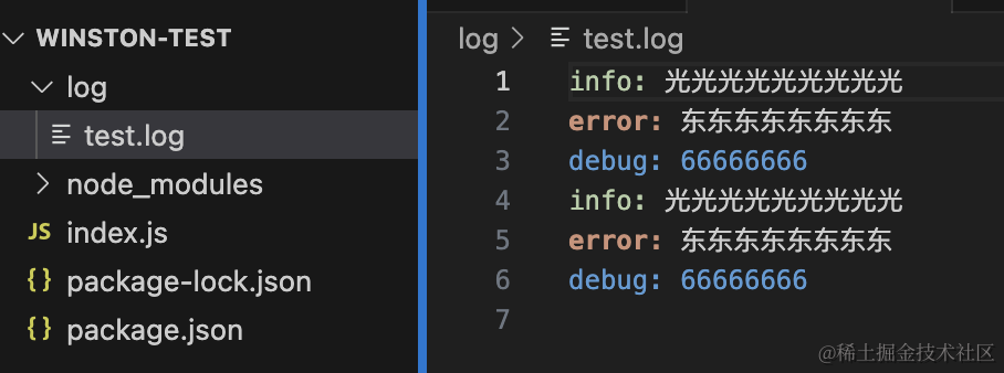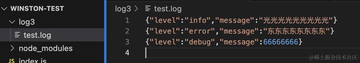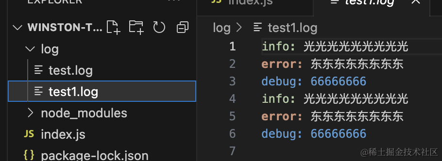 node index.js可以看到控制台和文件里都有了打印的日志。