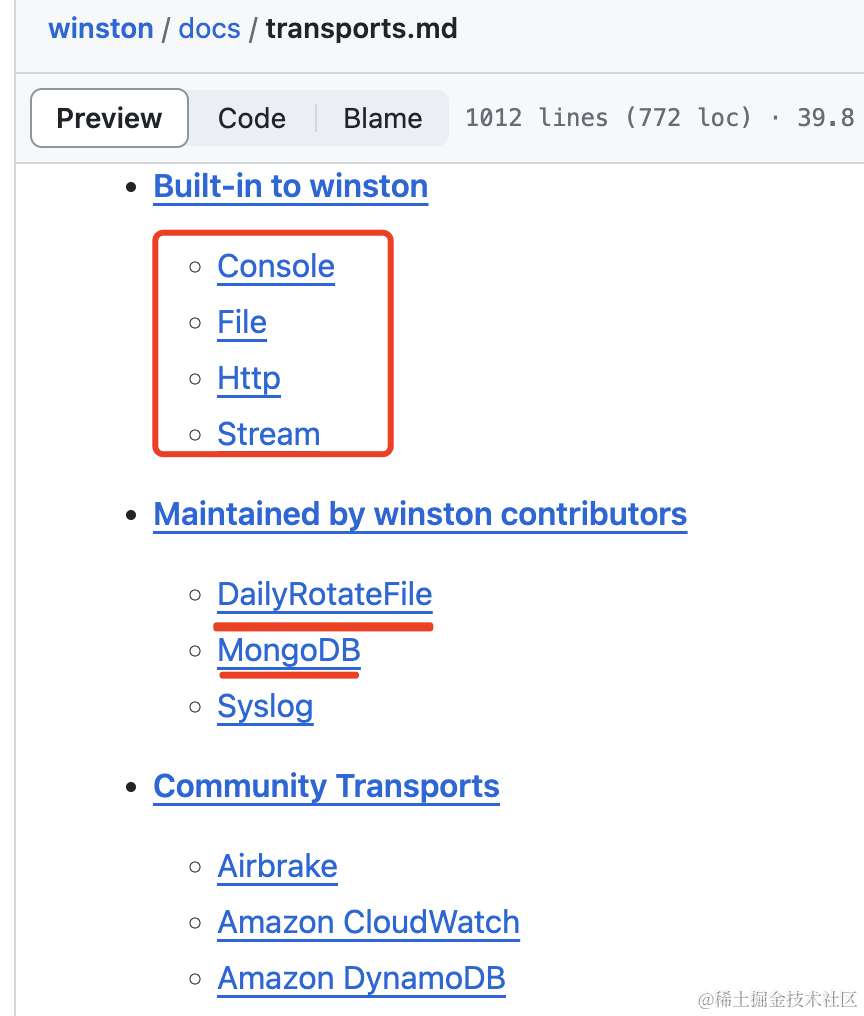 下面还有很多社区的 Transport,比如 MongoDB 的 Transport,很明显就是把日志写入 mongodb 的。