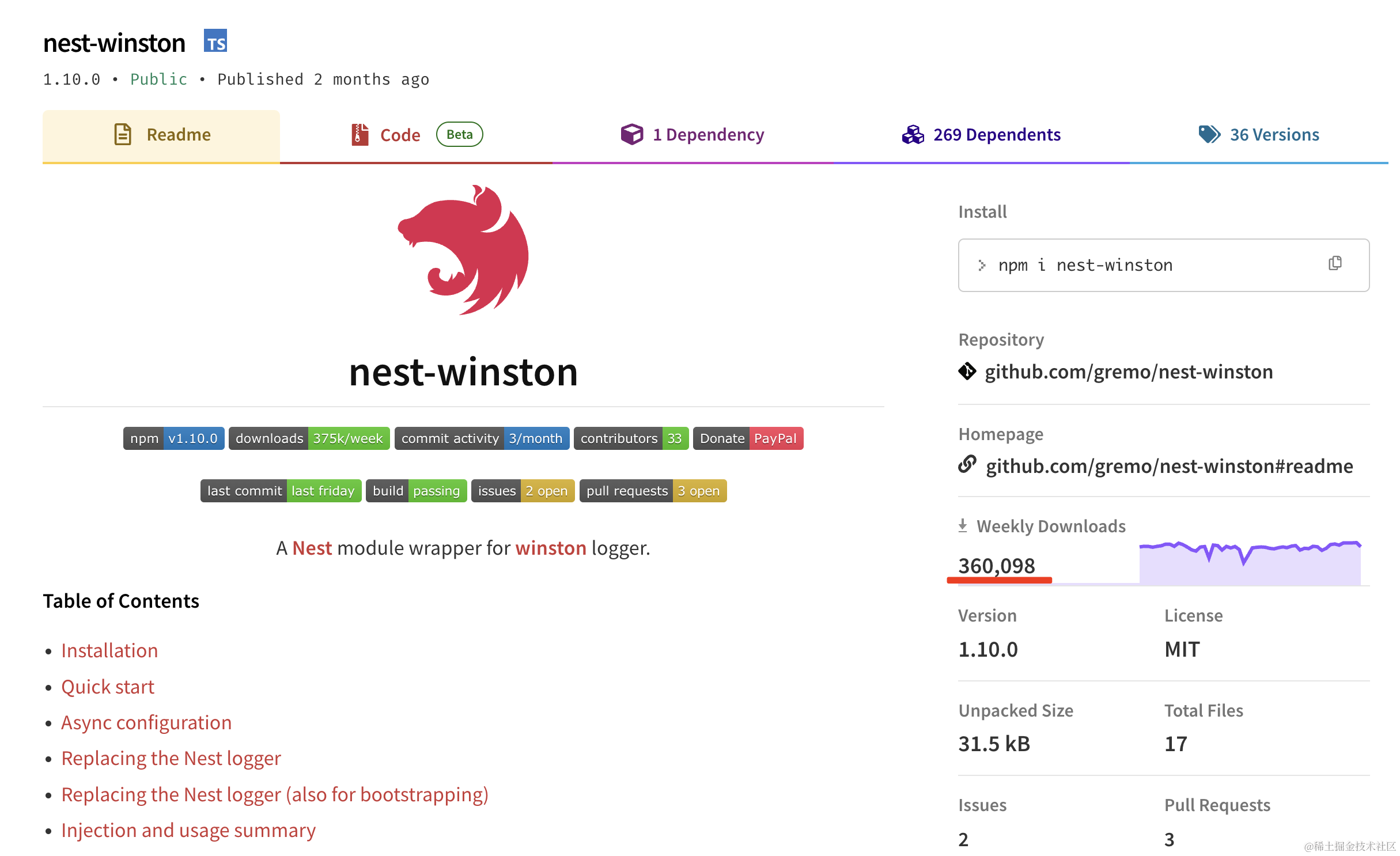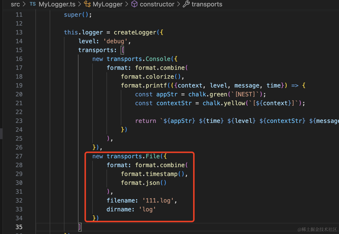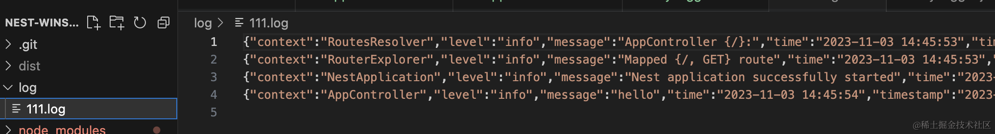private logger;当然,其实这个模块没必要自己封装,社区有已经封装好的可以直接用:nest-winston