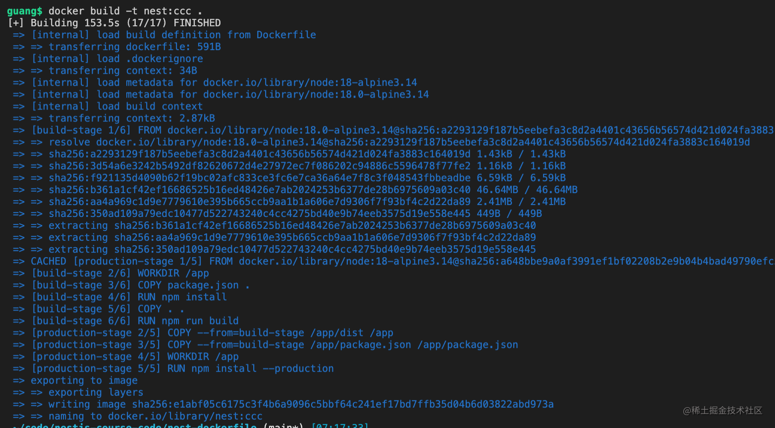 docker build -t nest:first .镜像名为 nest、标签为 first,构建上下文是当前目录