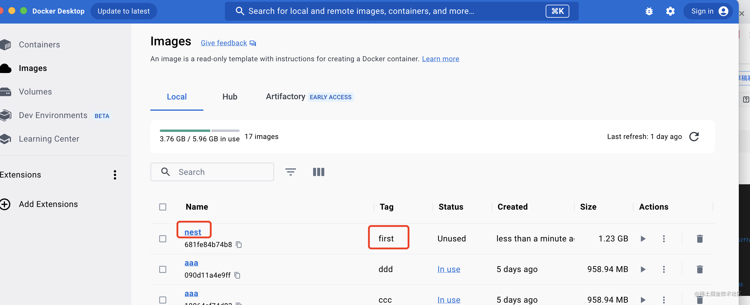 然后就可以在 docker desktop 里看到你构建出来的镜像了: