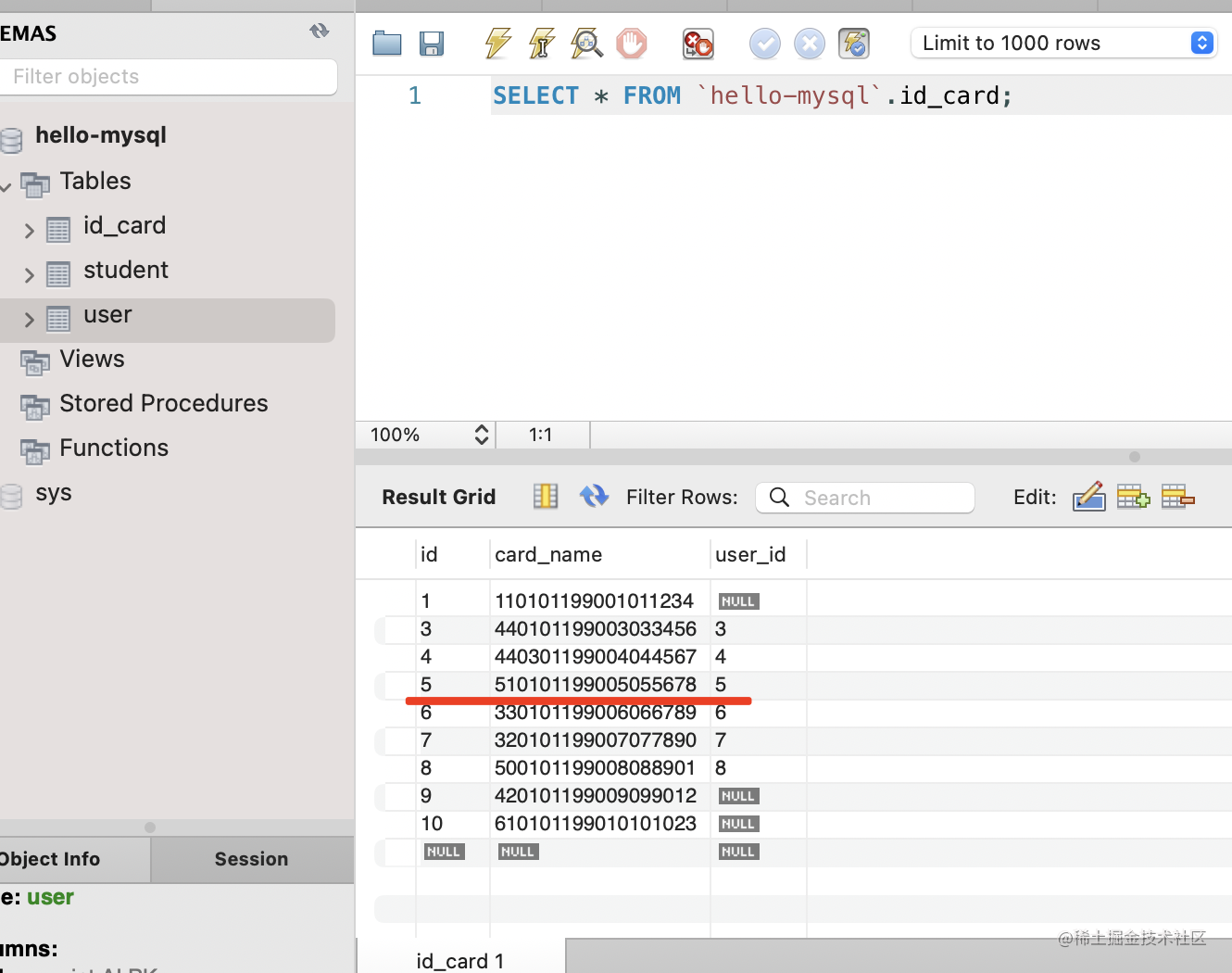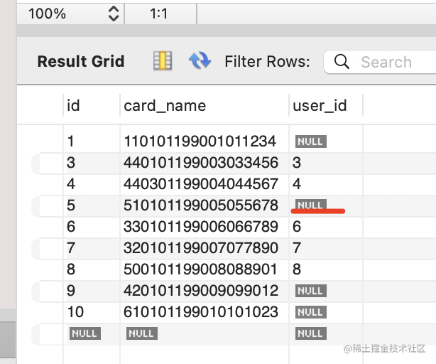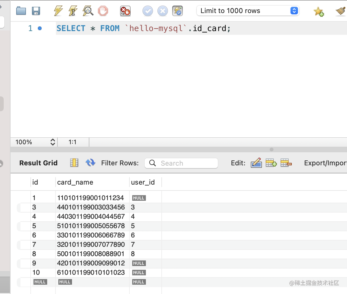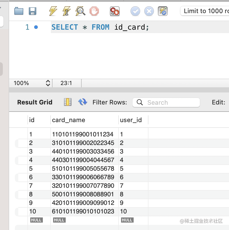 查询下现在的 id_card 表的数据: