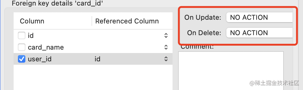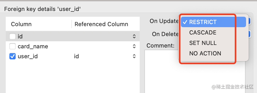 此外,外键还可以设置级联方式,也就是主表修改 id 或者删除的时候,从表怎么做。