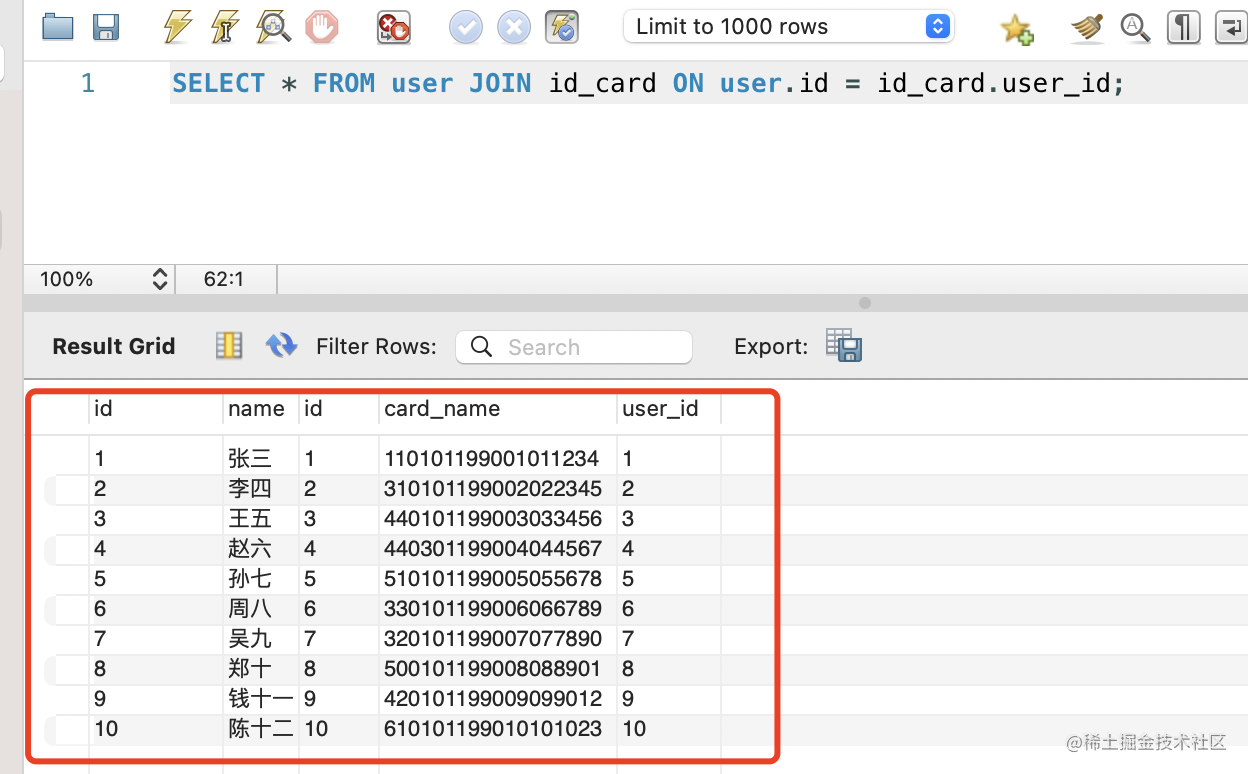 SELECT * FROM user JOIN id_card ON user.id = id_card.user_id;这里用到了 JOIN ON,也就是连接 user 和 id_card 表,关联方式是 user.id = id_card.user_id,也就是 id_card 表中的外键关联 user 表的主键。