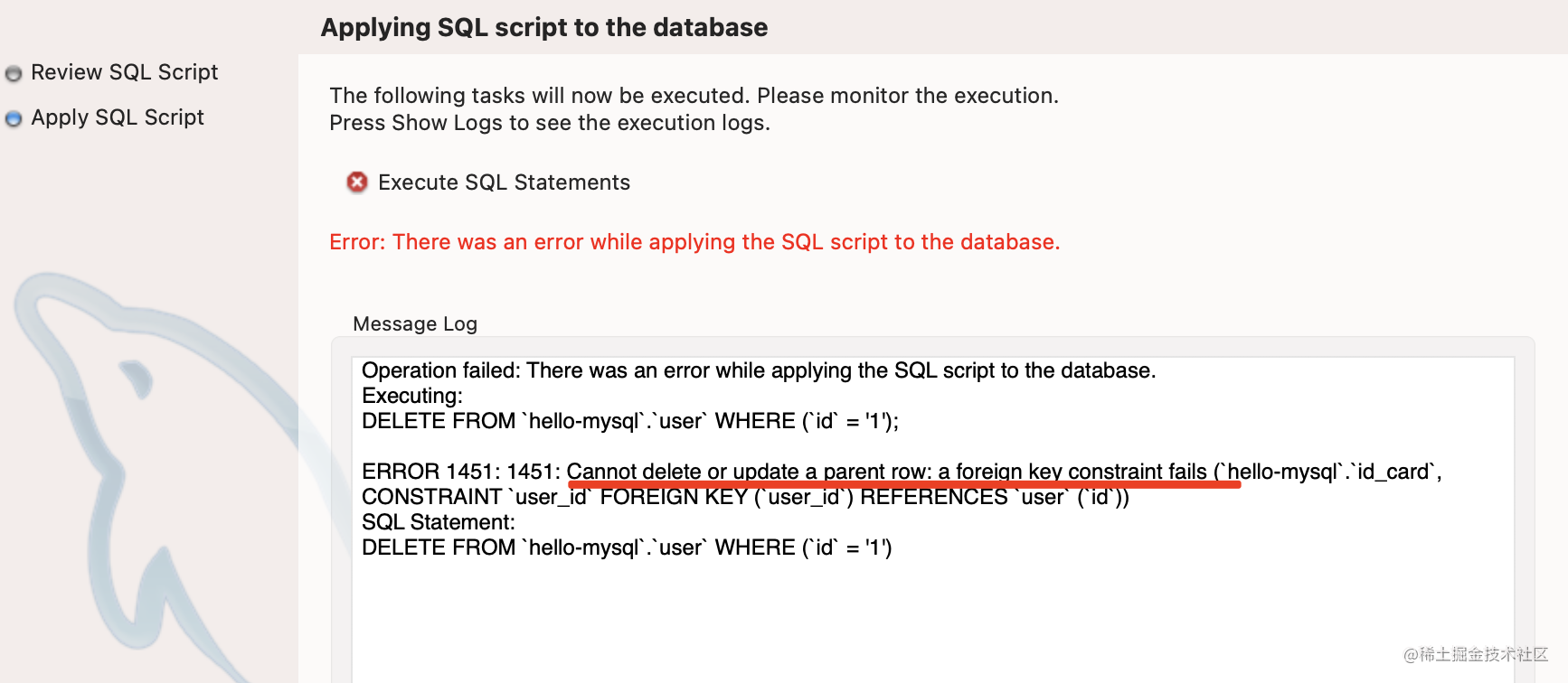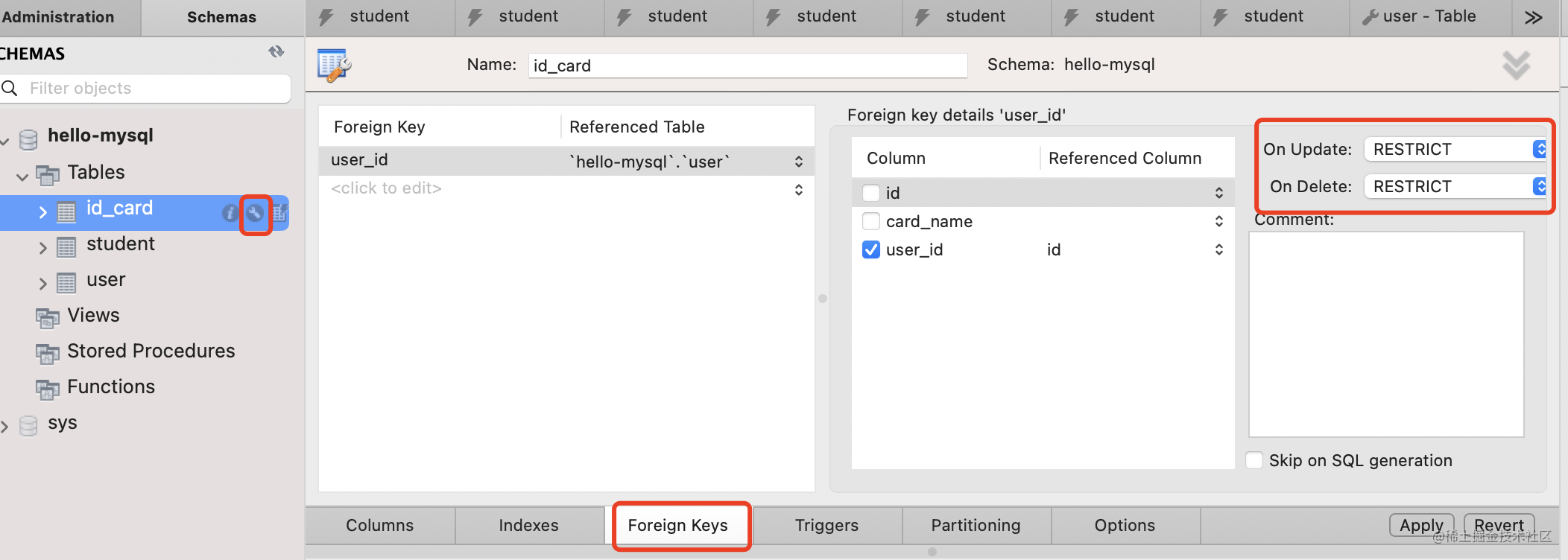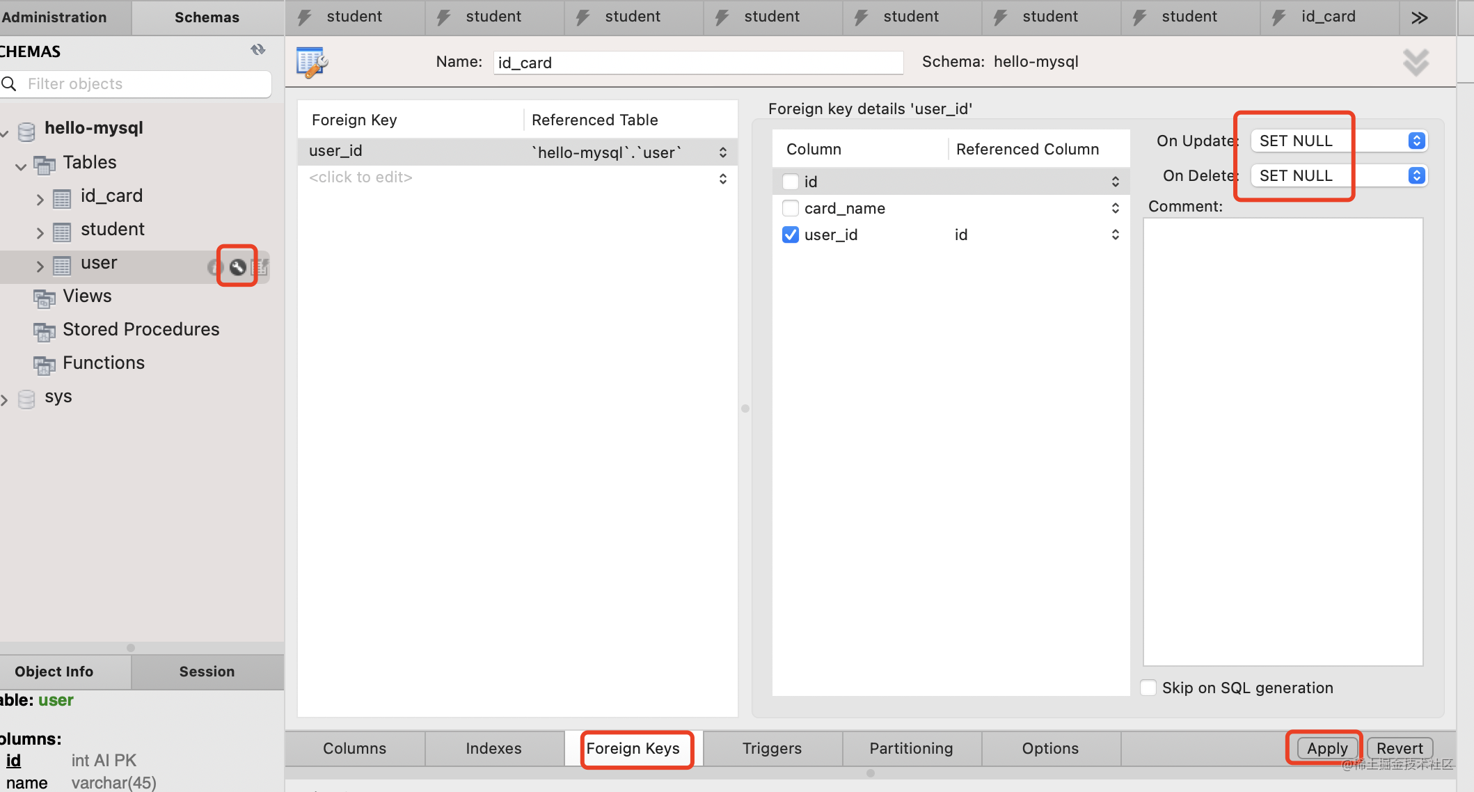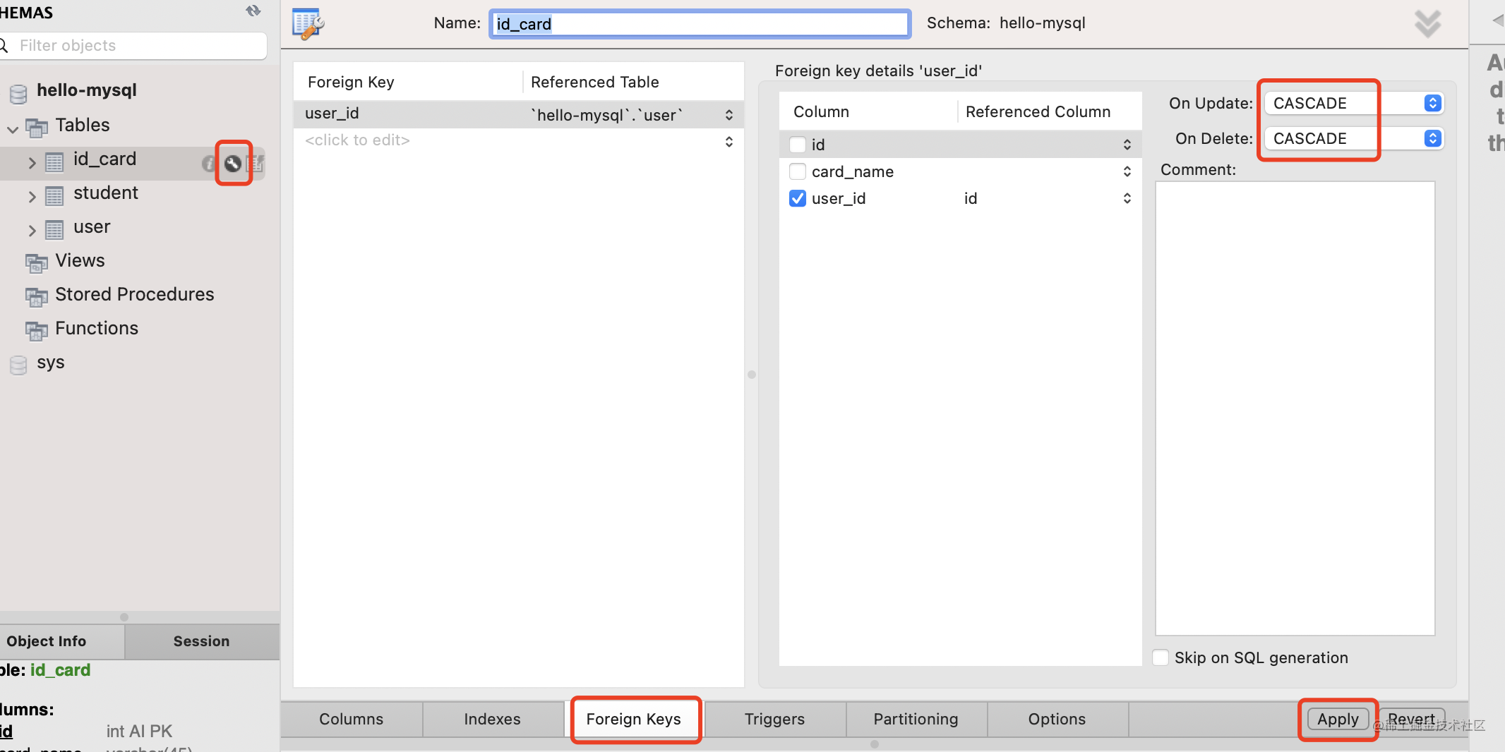修改外键级联方式为 CASCADE,点击 apply。