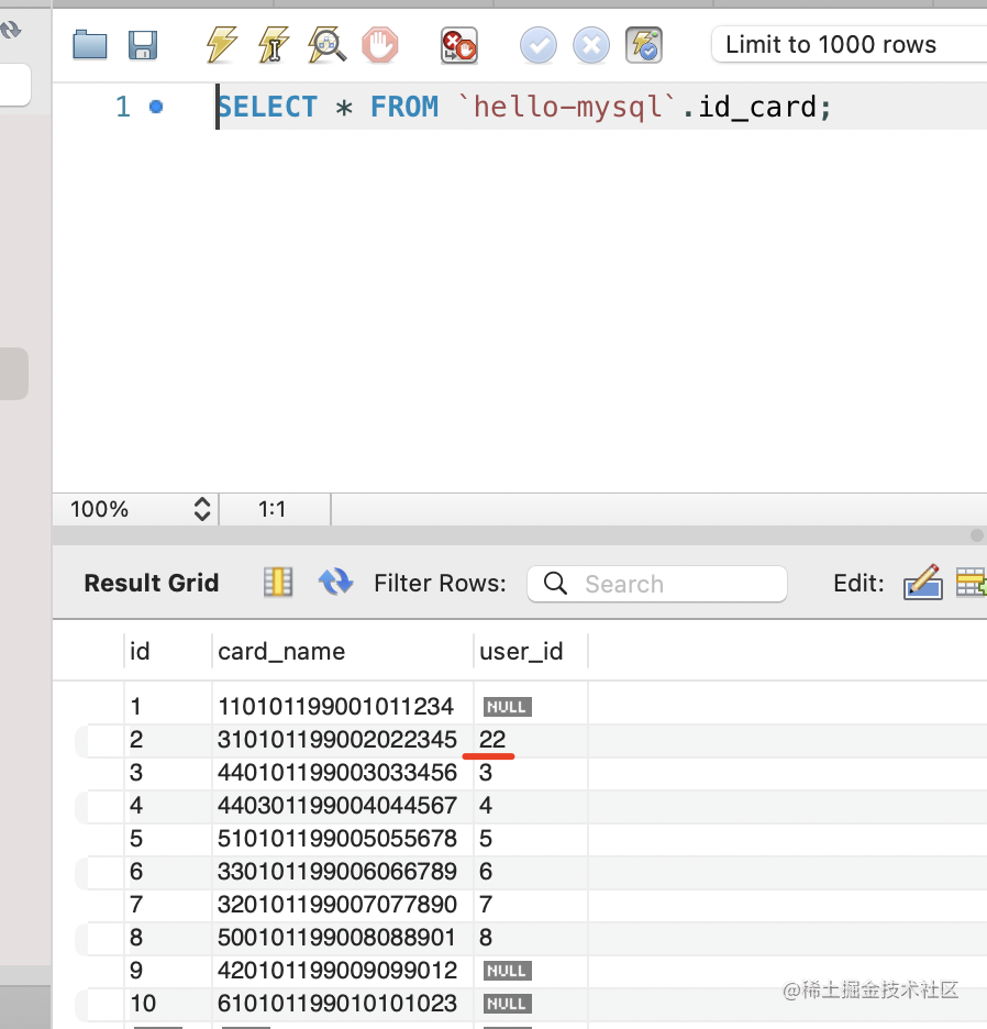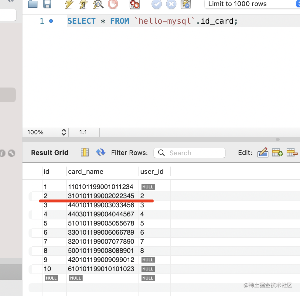 先看一下现在 id_card 表的数据: