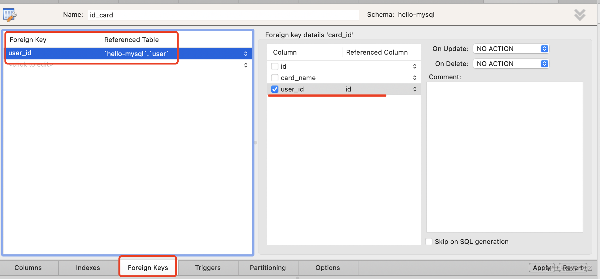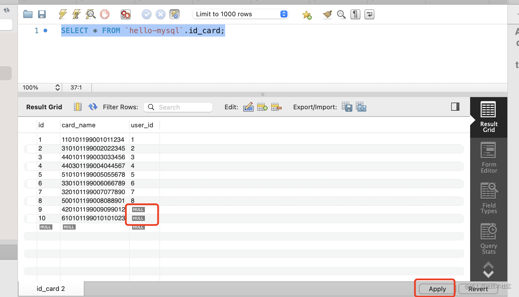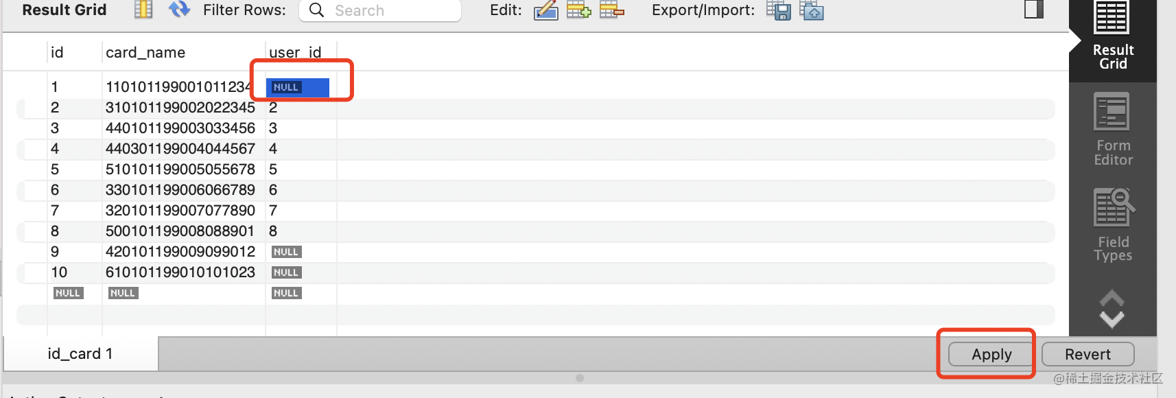 我们把 id_card 表的最后两条记录的 user_id 删掉,点击 apply。