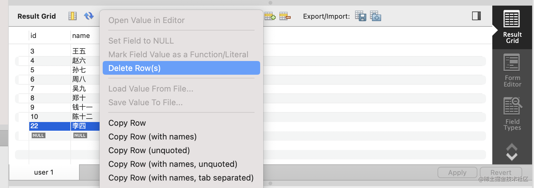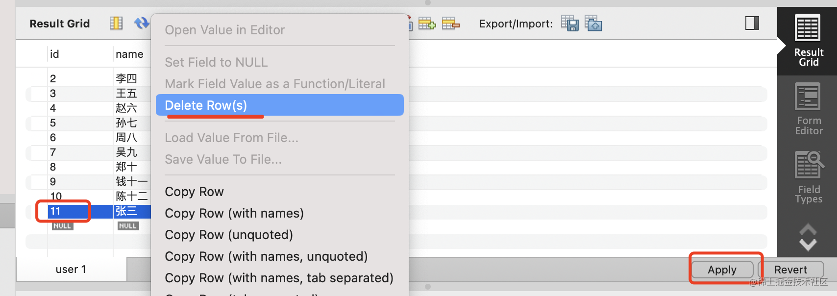 然后把 id 为 22 的 user 删除掉,点击 apply: