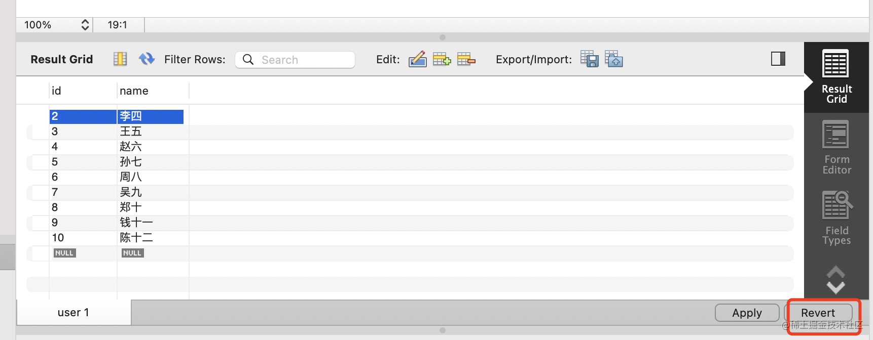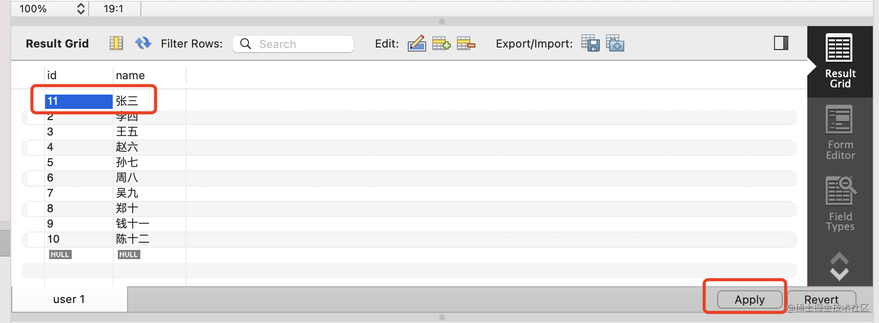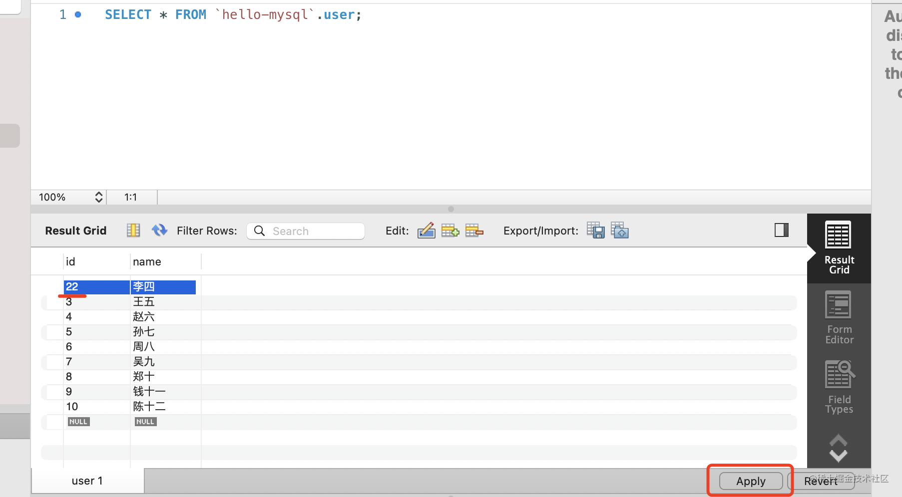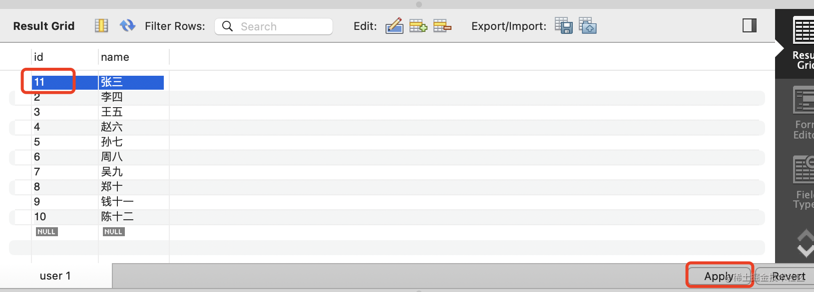 把 id 为 2 的 user 的 id 改为 22,点击 apply: