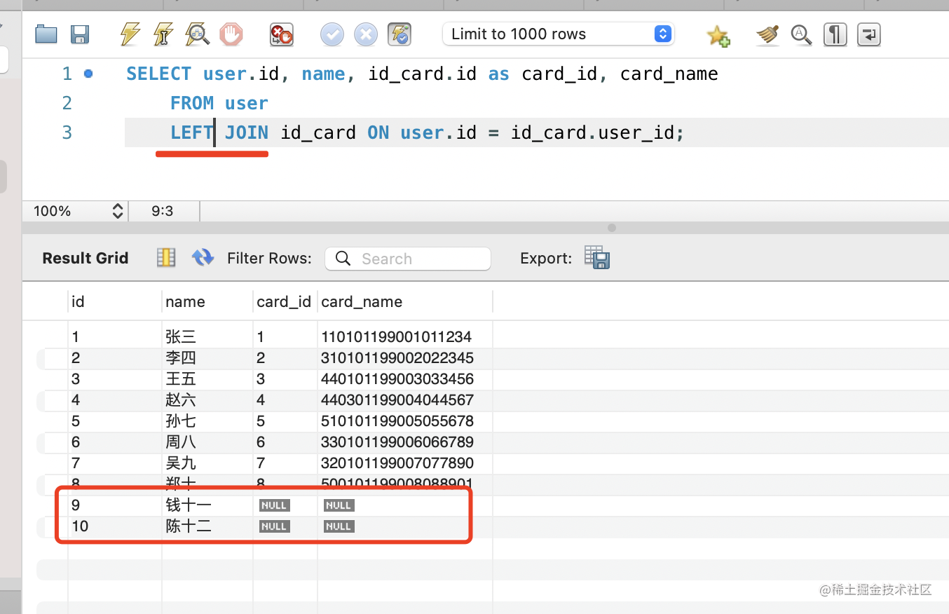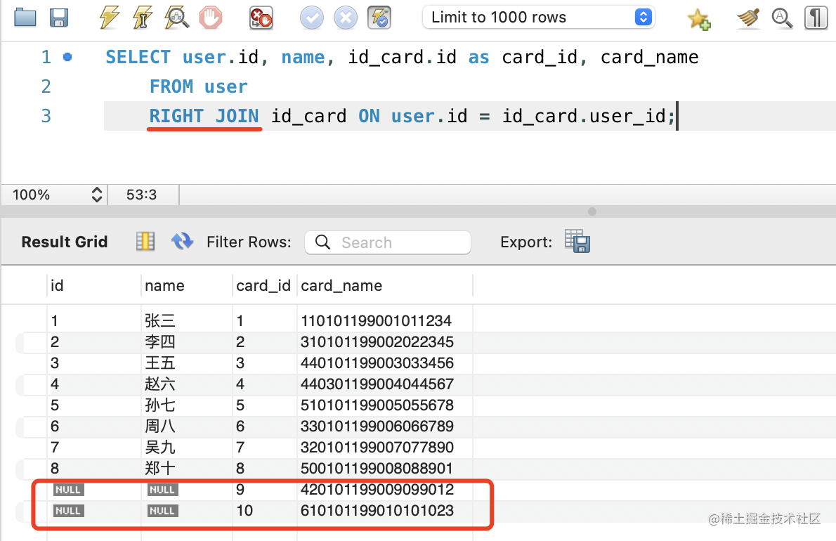 RIGHT JOIN id_card ON user.id = id_card.user_id;当使用 RIGHT JOIN 时,会额外返回右表中没有关联的数据: