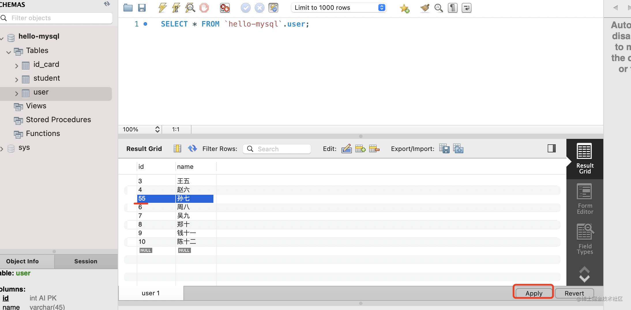 把 user 表中 id 为 5 的记录 id 改为 55,点击 apply: