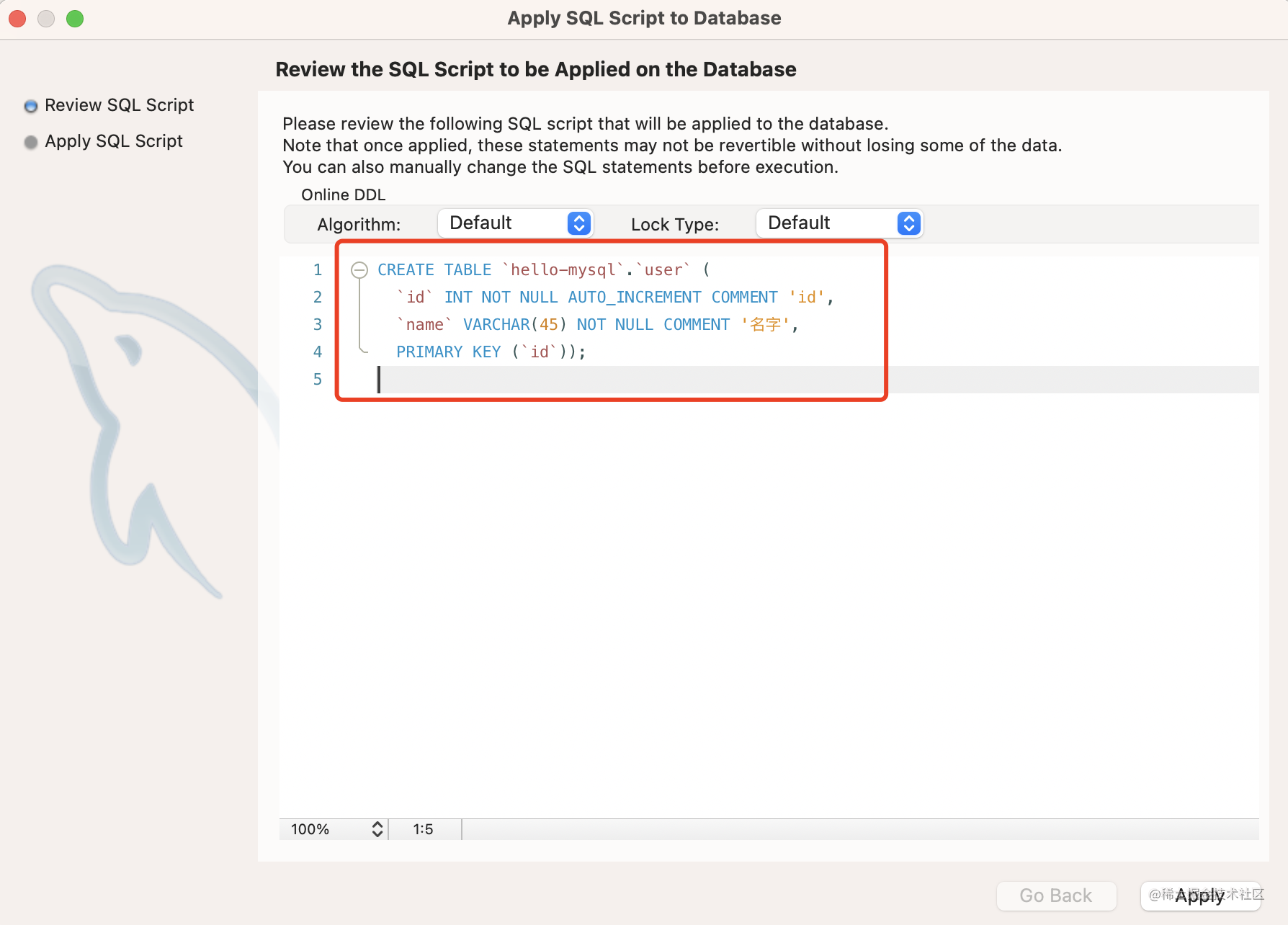 点击 apply,建表 sql 如下:
