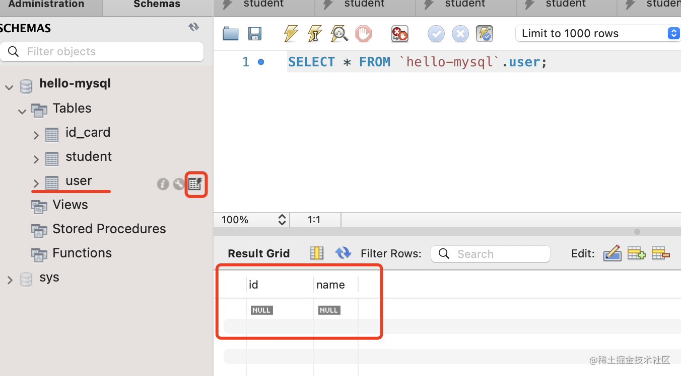 然后就可以看到 user 和 id_card 表了: