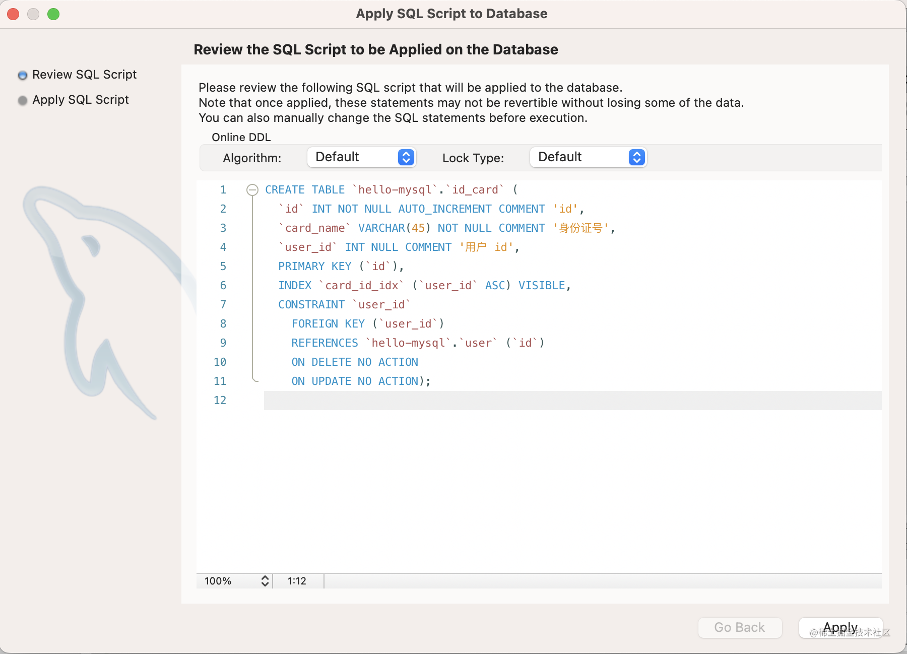 点击 apply,生成的建表 sql 是这样的: