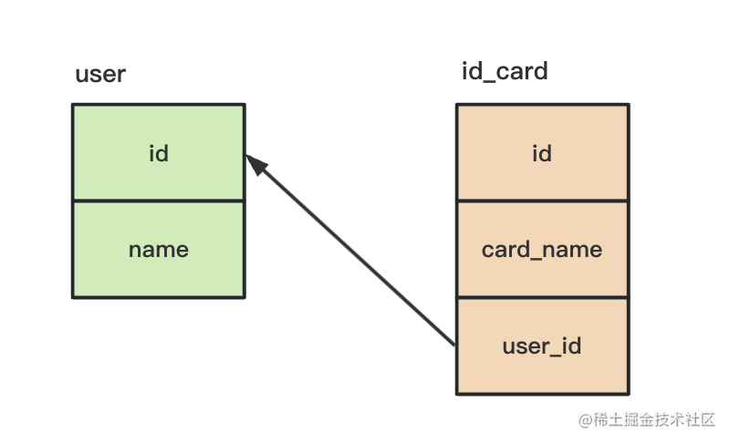 那 id_card 想查找 user,自然也是通过 id 来查找,多一个列来存储 user id 就可以实现这种一对一的关联。