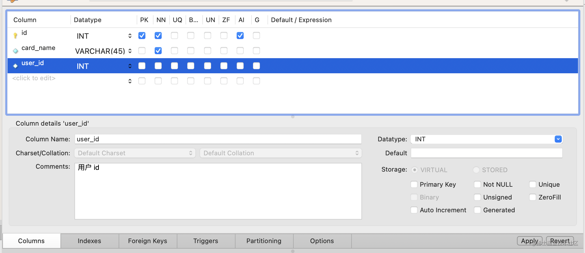 前面的三行都比较好理解,就是指定每一列的类型、约束、注释。