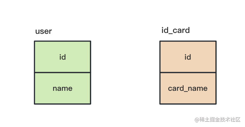 这样两个表,分别存储用户信息,还有身份证信息: