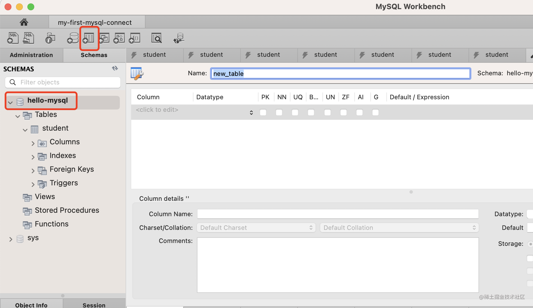 选中 hello-mysql 数据库,点击建表按钮:
