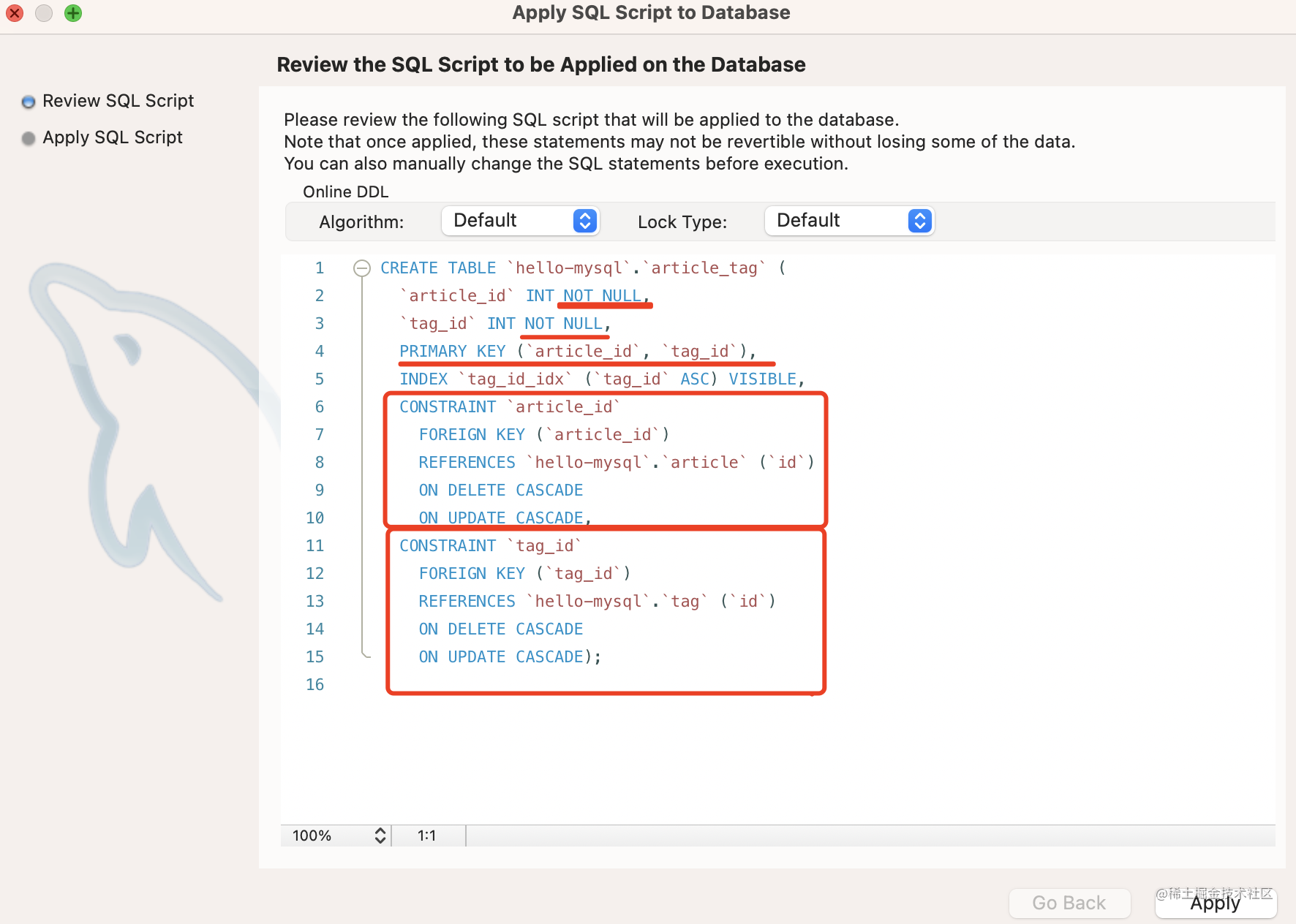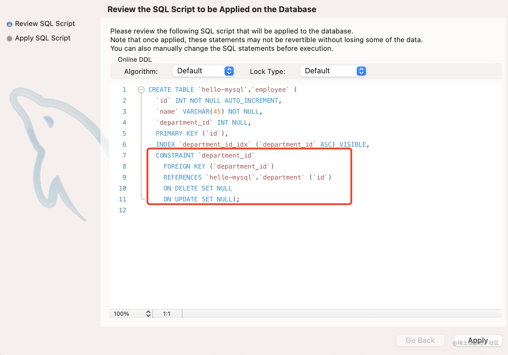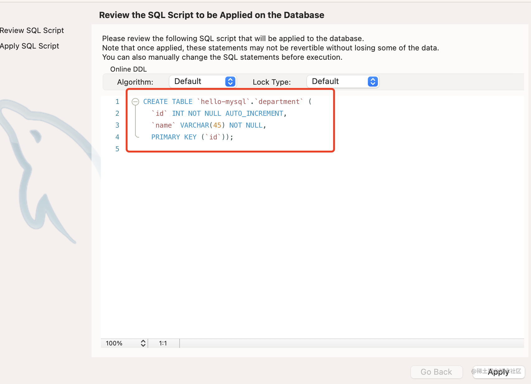 点击 apply,可以看到生成的 sql: