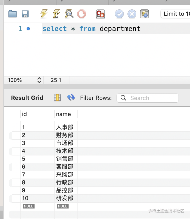 (10, '研发部');查询下: