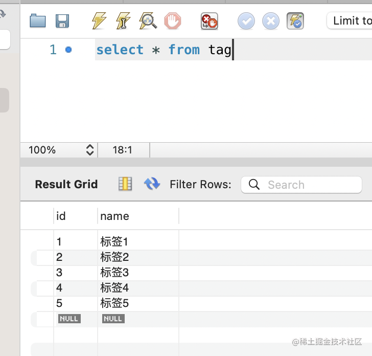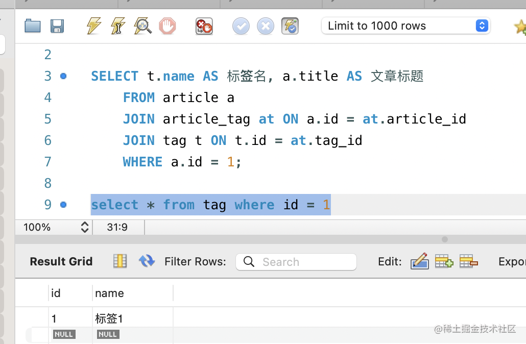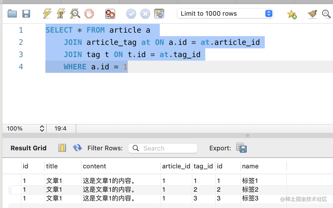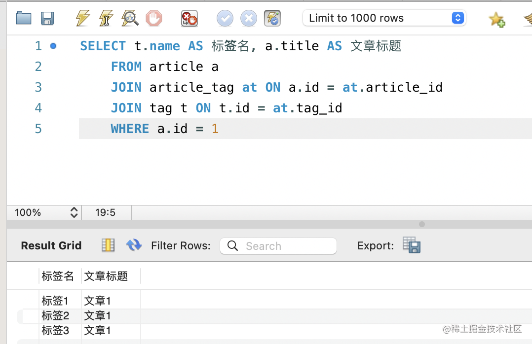 WHERE a.id = 1这样查询出的就是 id 为 1 的 article 的所有标签: