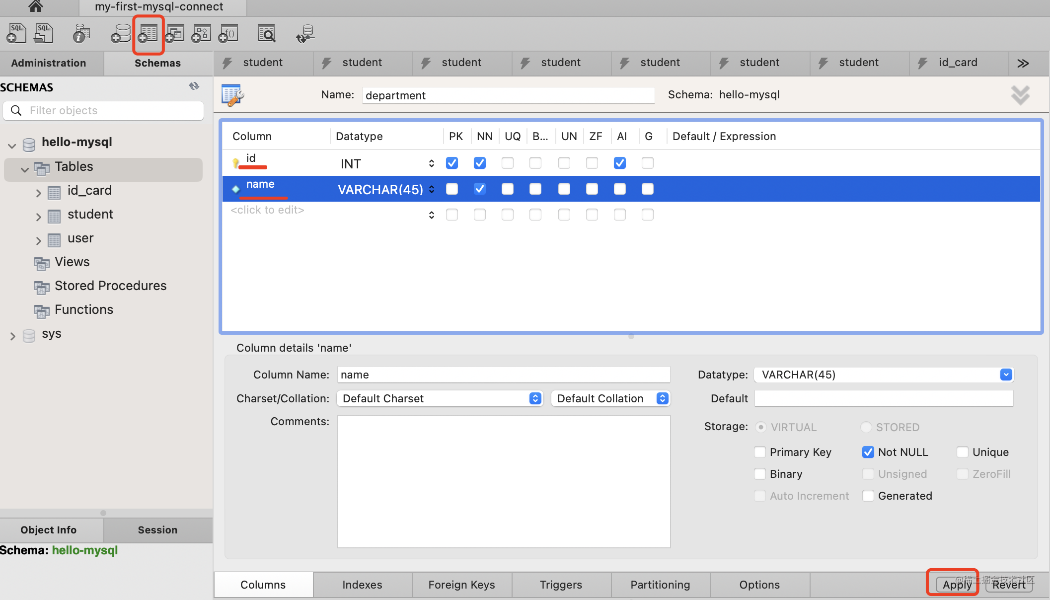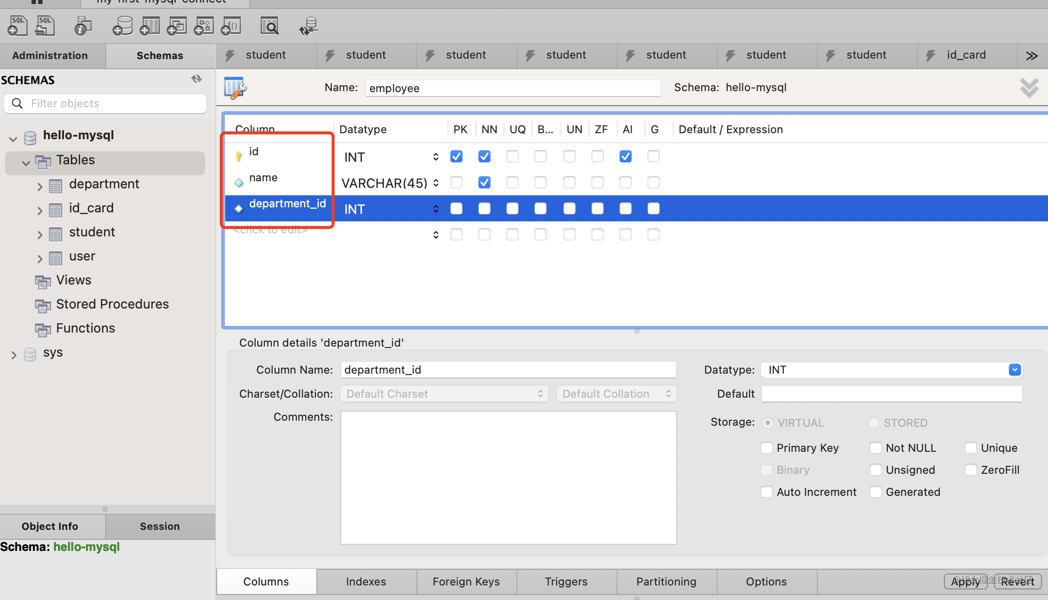 添加 id、name、department_id 这 3 列。