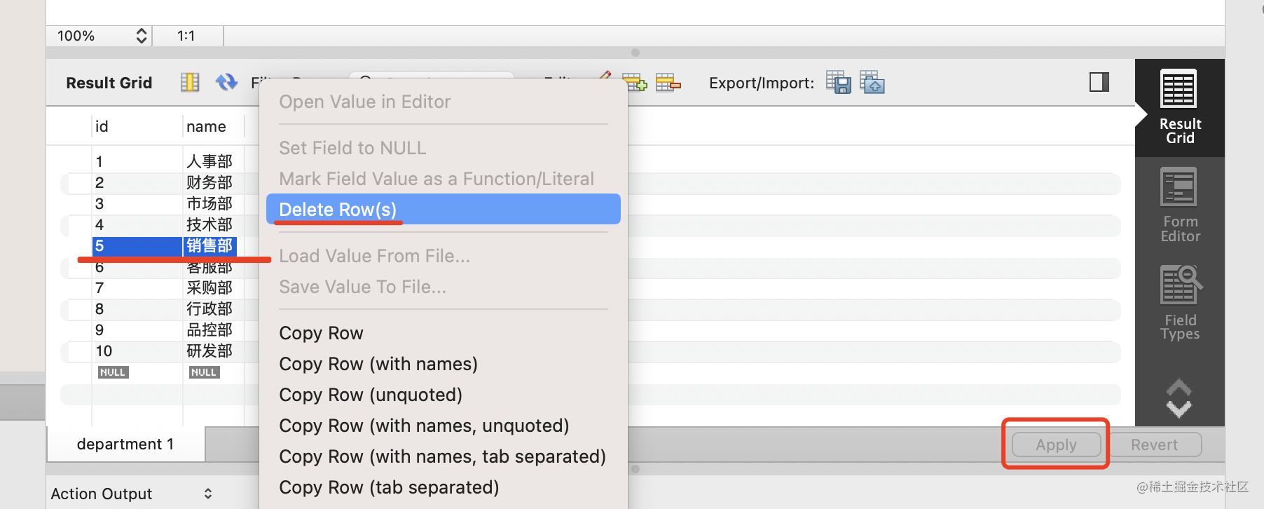 然后把 id 为 5 的部门删掉: