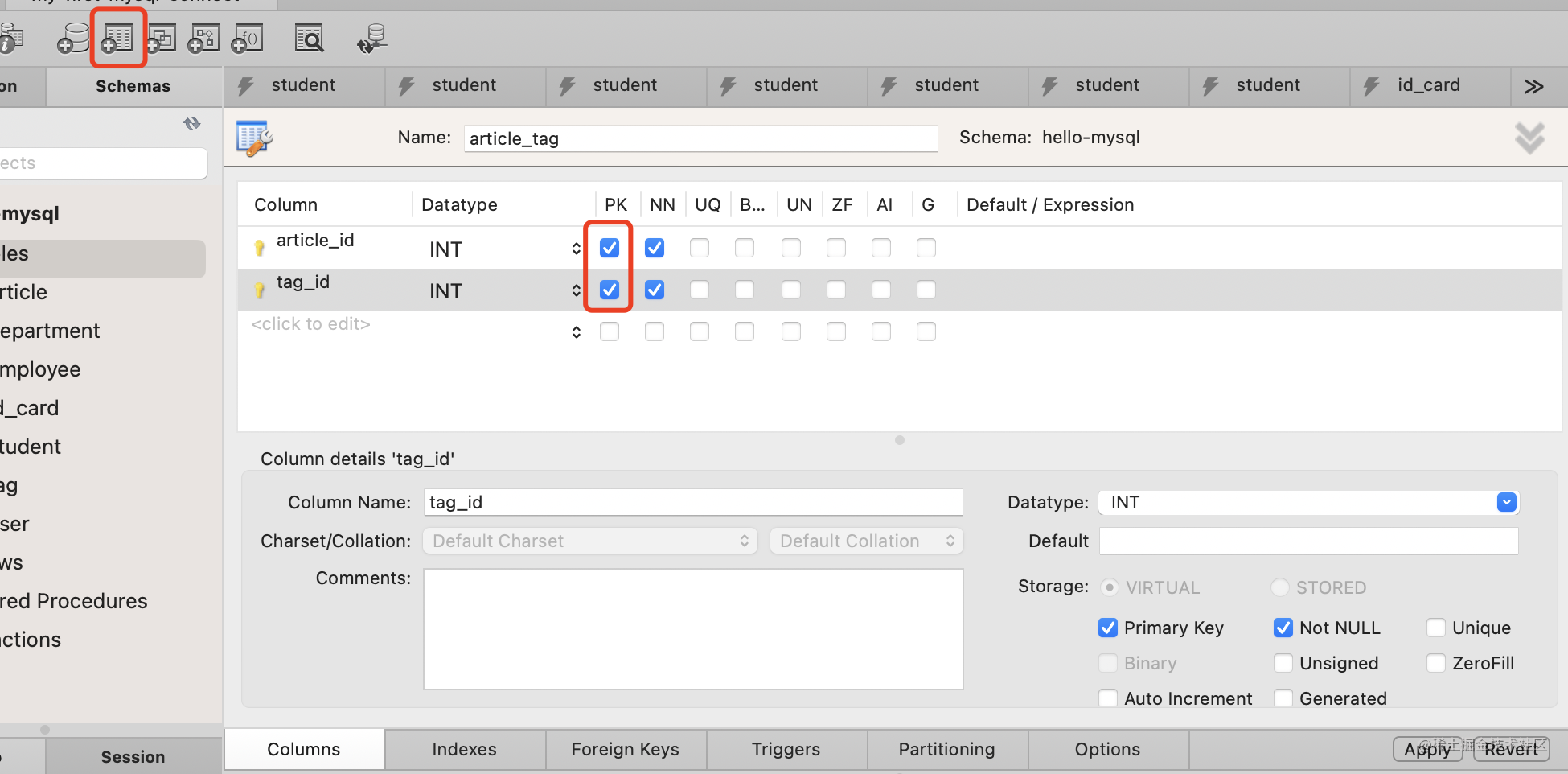 点击创建表,添加 article_id、tag_id 这俩列,设置为 NOT NULL。