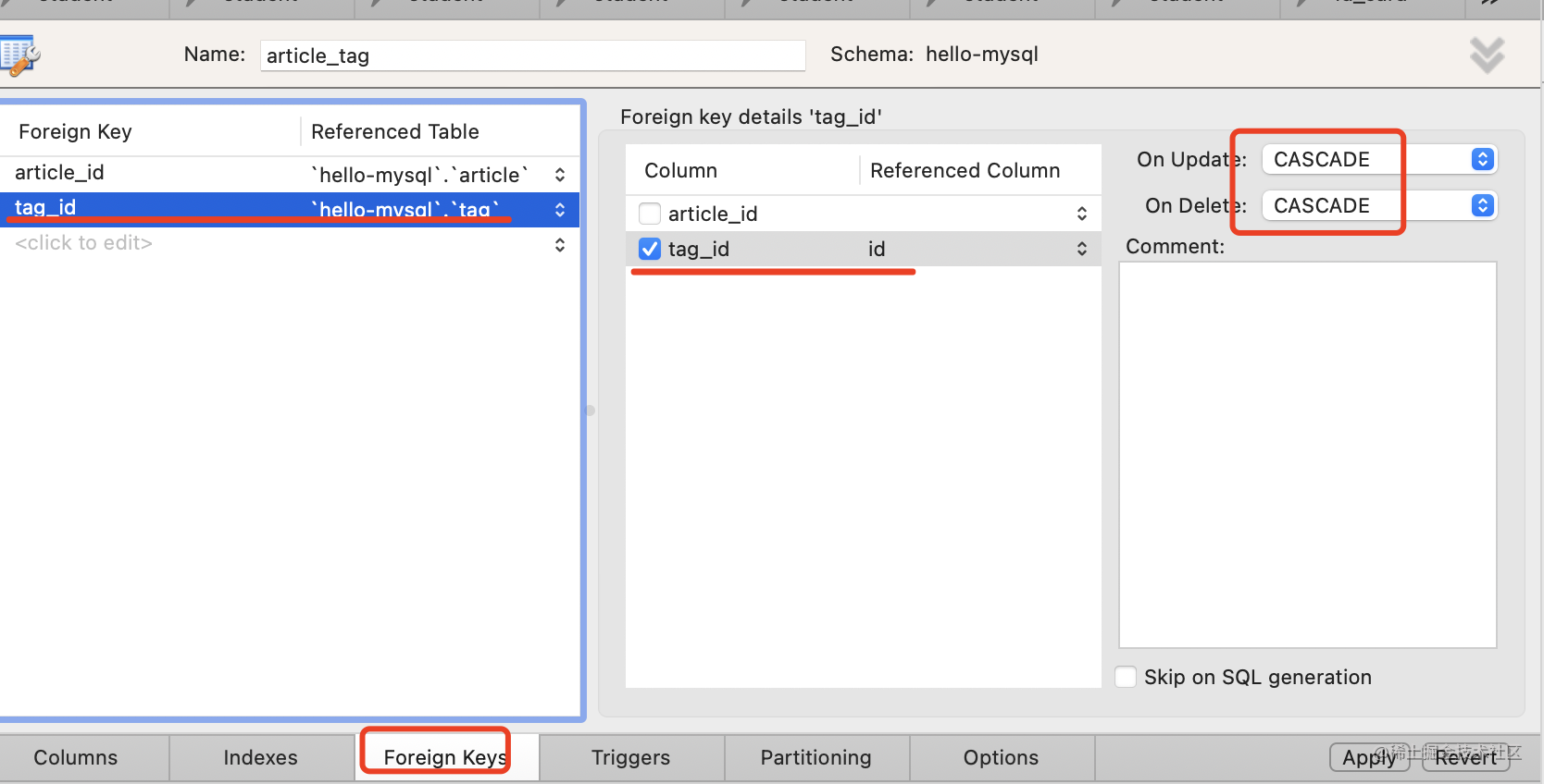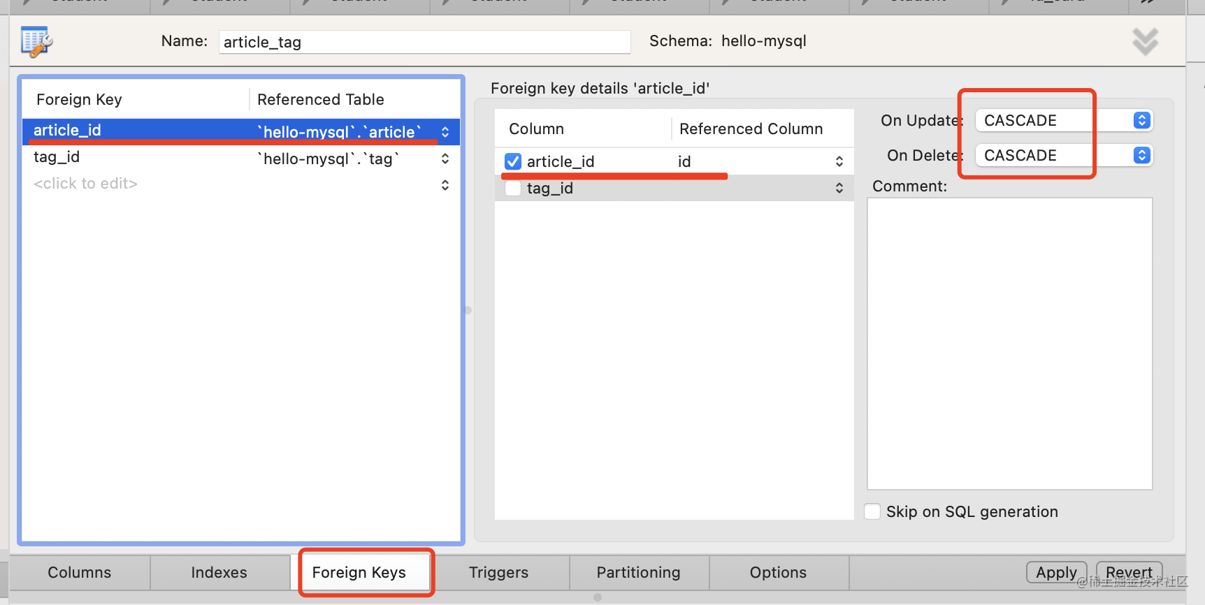 添加 article_id 和 tag_id 的外键引用: