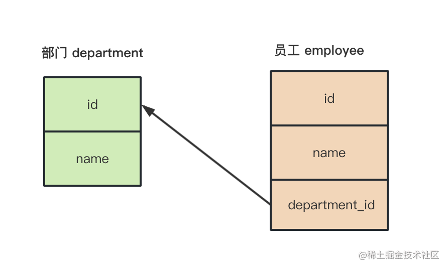 我们创建了部门、员工表,并在员工表添加了引用部门 id 的外键 department_id 来保存这种一堆多关系。