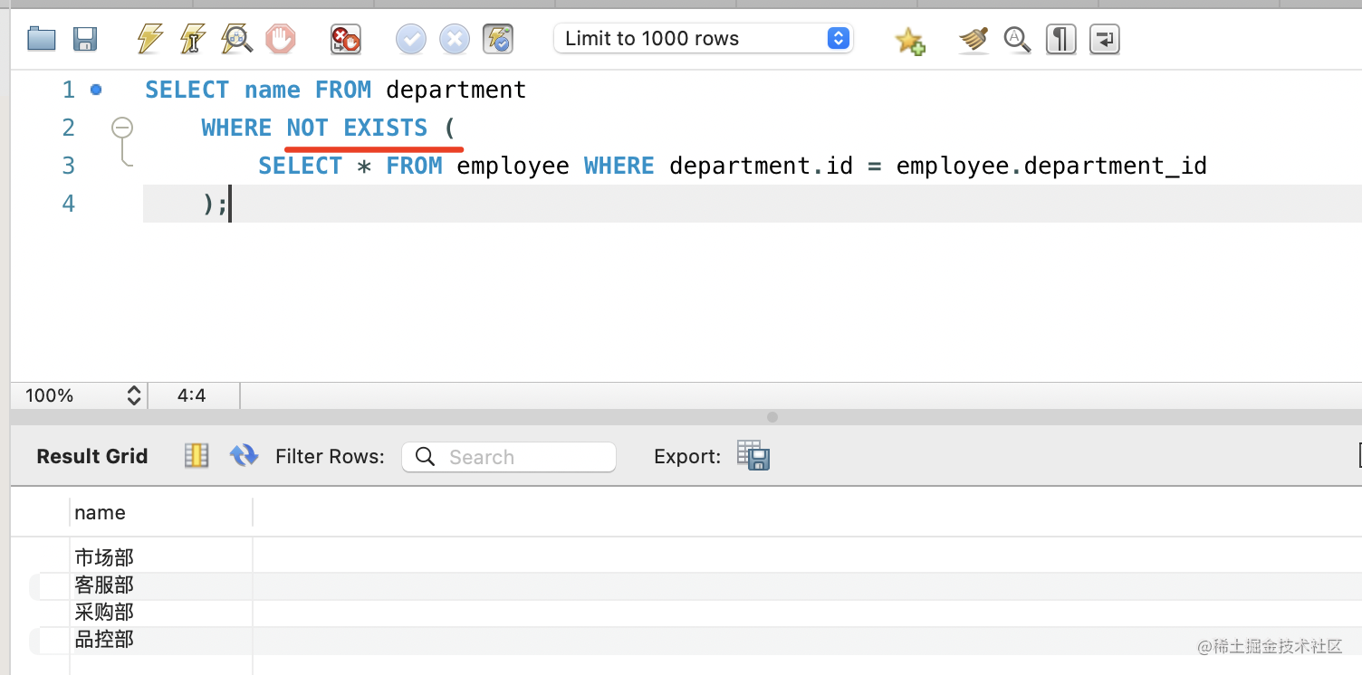 还可以用 NOT EXISTS 来查询所有没有员工的部门: