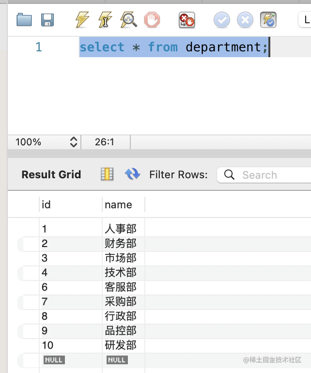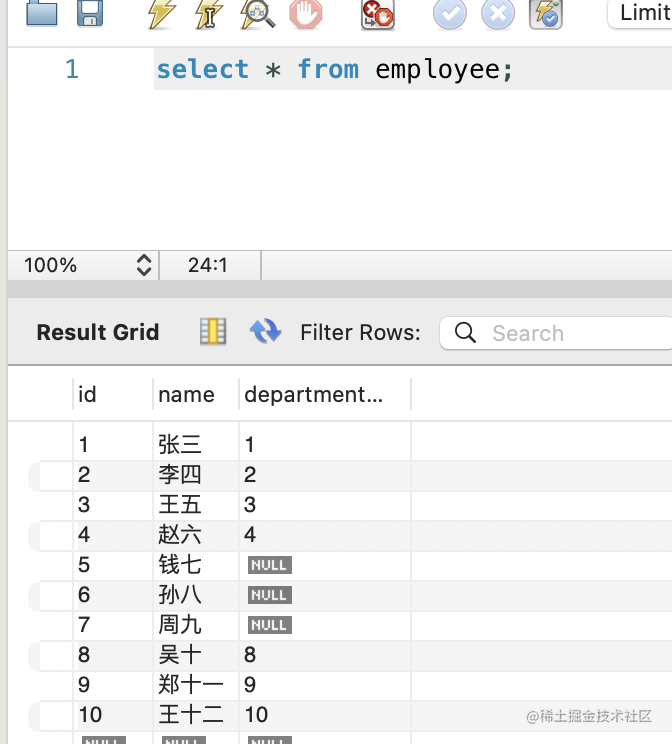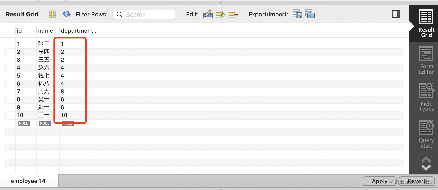 select * from department;select * from employee;改一下员工的部门,点击 apply:
