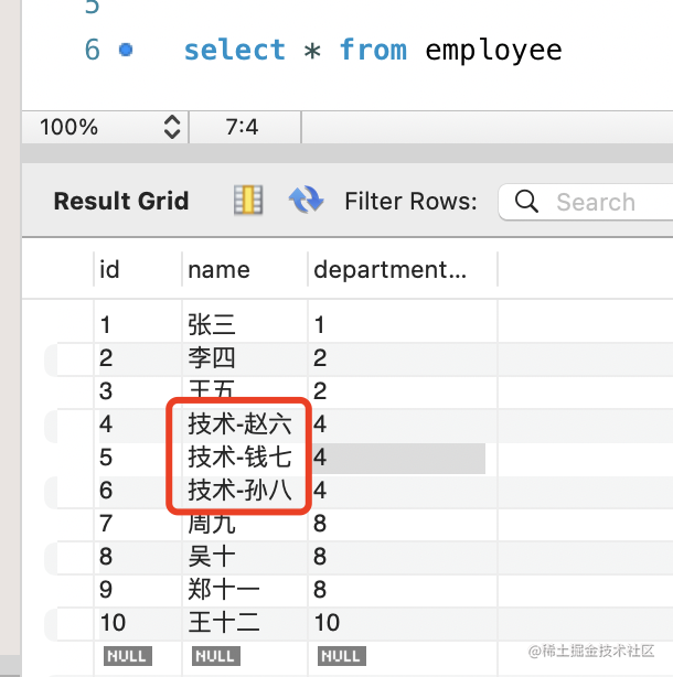 );查询名字等于技术部的 department 的 id,然后更新 department_id 为这个 id 的所有 employee 的名字为 CONCAT(“技术-”, name)。