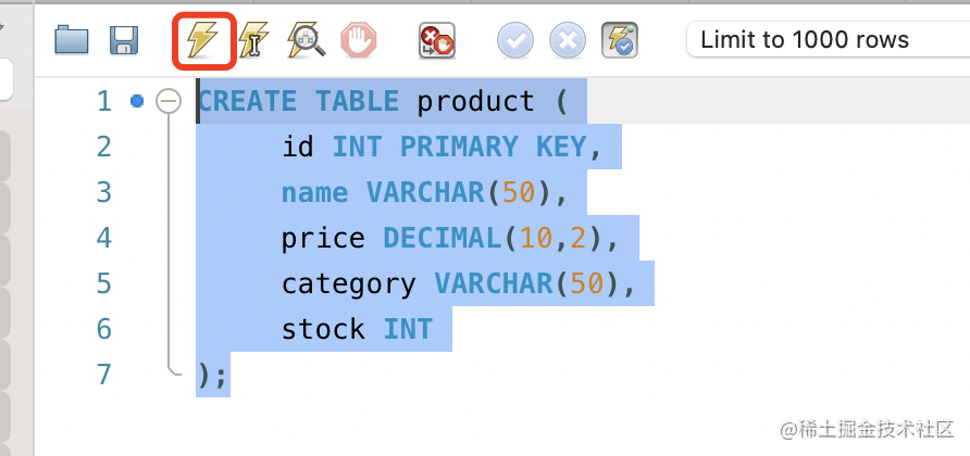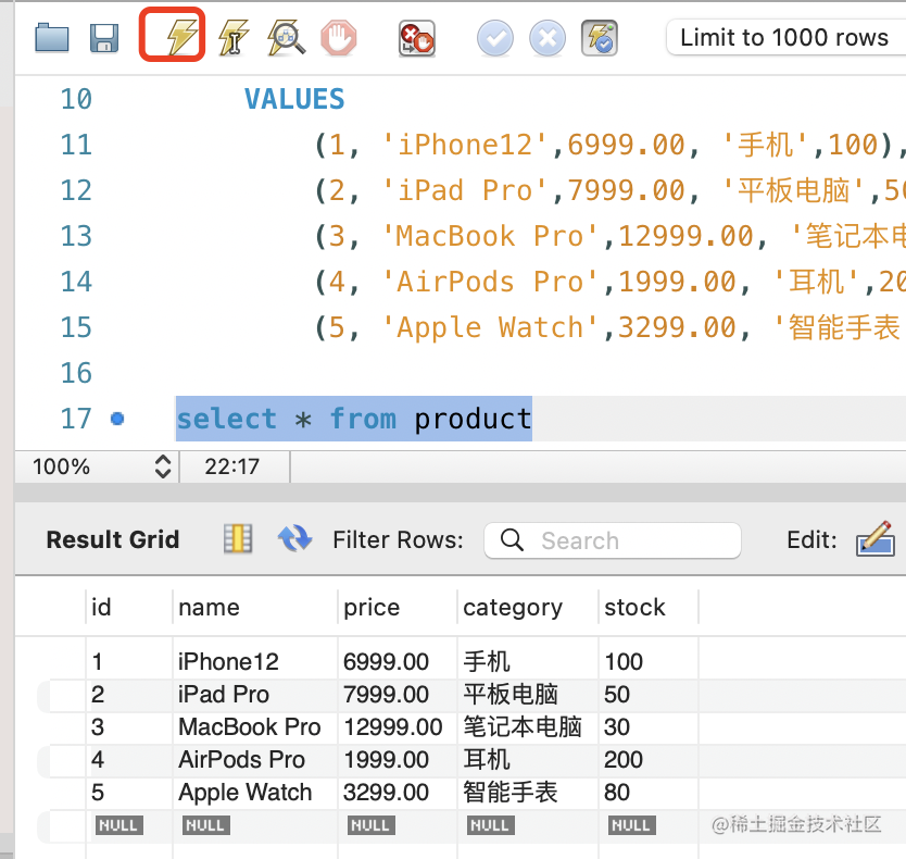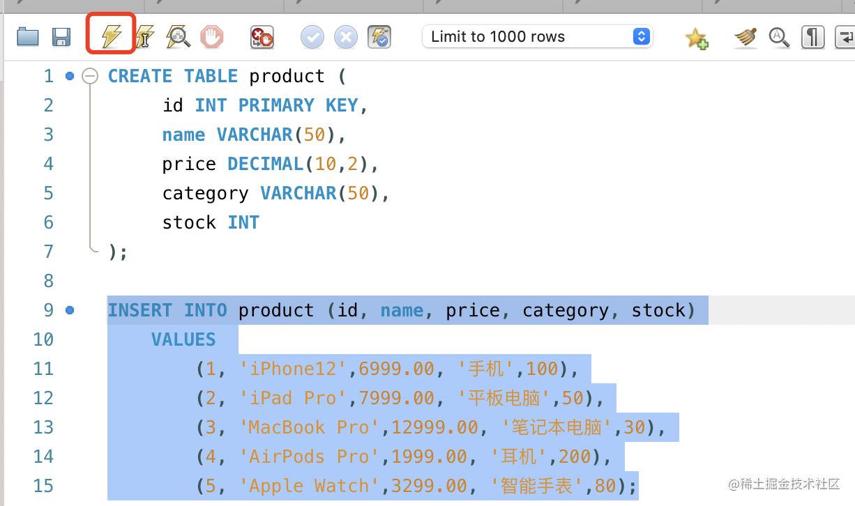 (5, 'Apple Watch',3299.00, '智能手表',80);选中 sql,点击执行: