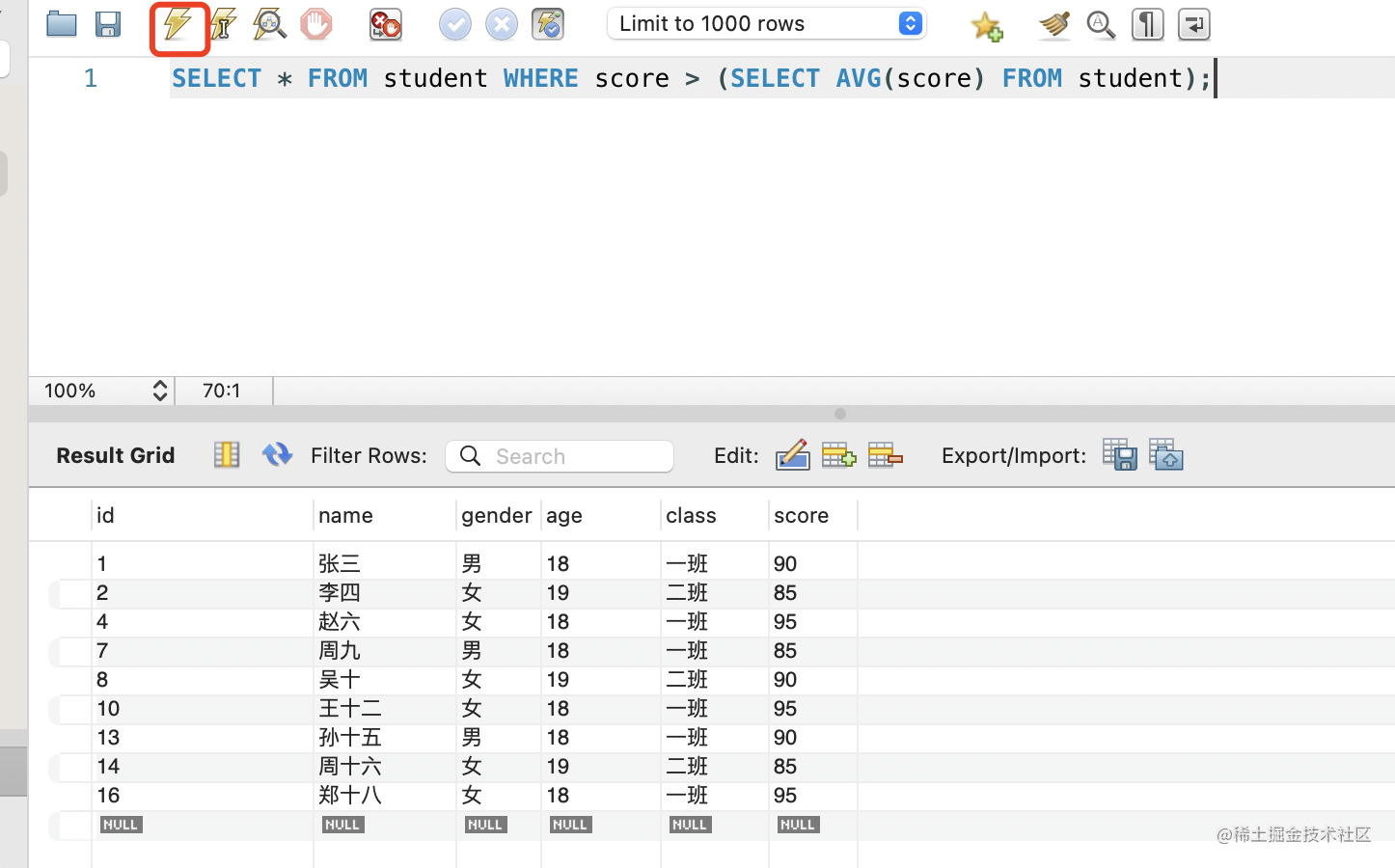 SELECT * FROM student WHERE score > (SELECT AVG(score) FROM student);先一个 select 语句查询学生的平均分,然后查询分数大于这个平均分的学生。