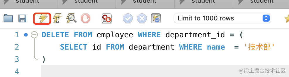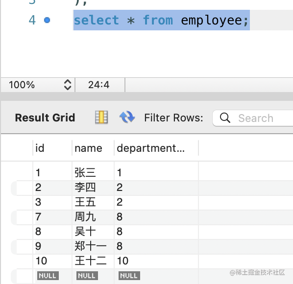 select * from employee;可以看到技术部员工确实都没有了。