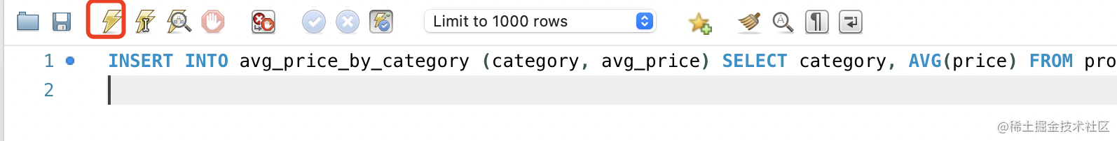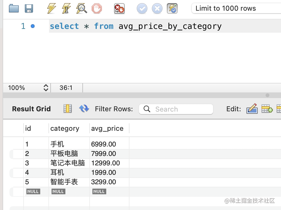 比如我们把每个产品分类的分类名、平均价格查出来放入另一个 avg_price_by_category 表。