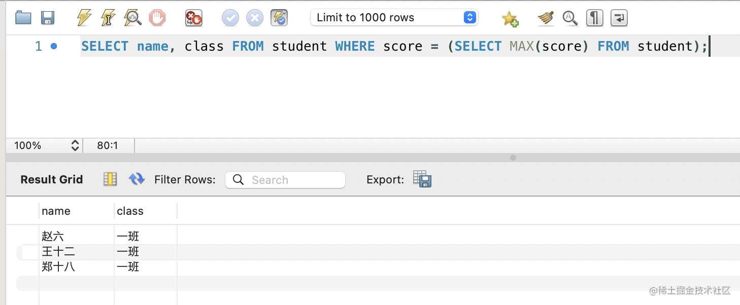 select * from student;然后我们想查询学生表中成绩最高的学生的姓名和班级名称。
