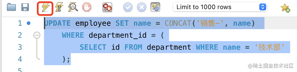 比如之前的 department 和 employee 表,我们想把技术部所有人的 name 前加上 “技术-”,就可以这么写: