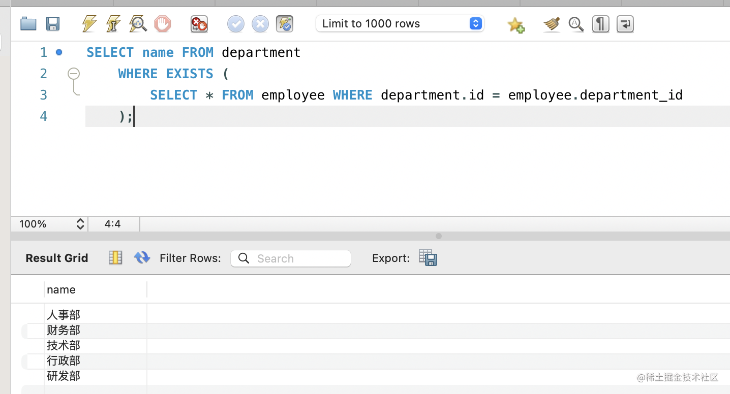如果存在员工,那么条件成立,就返回这个部门的 name。