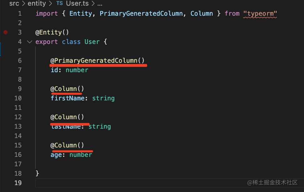 我们看下代码,有这样一个 entity,通过装饰器声明了主键列和其他的列: