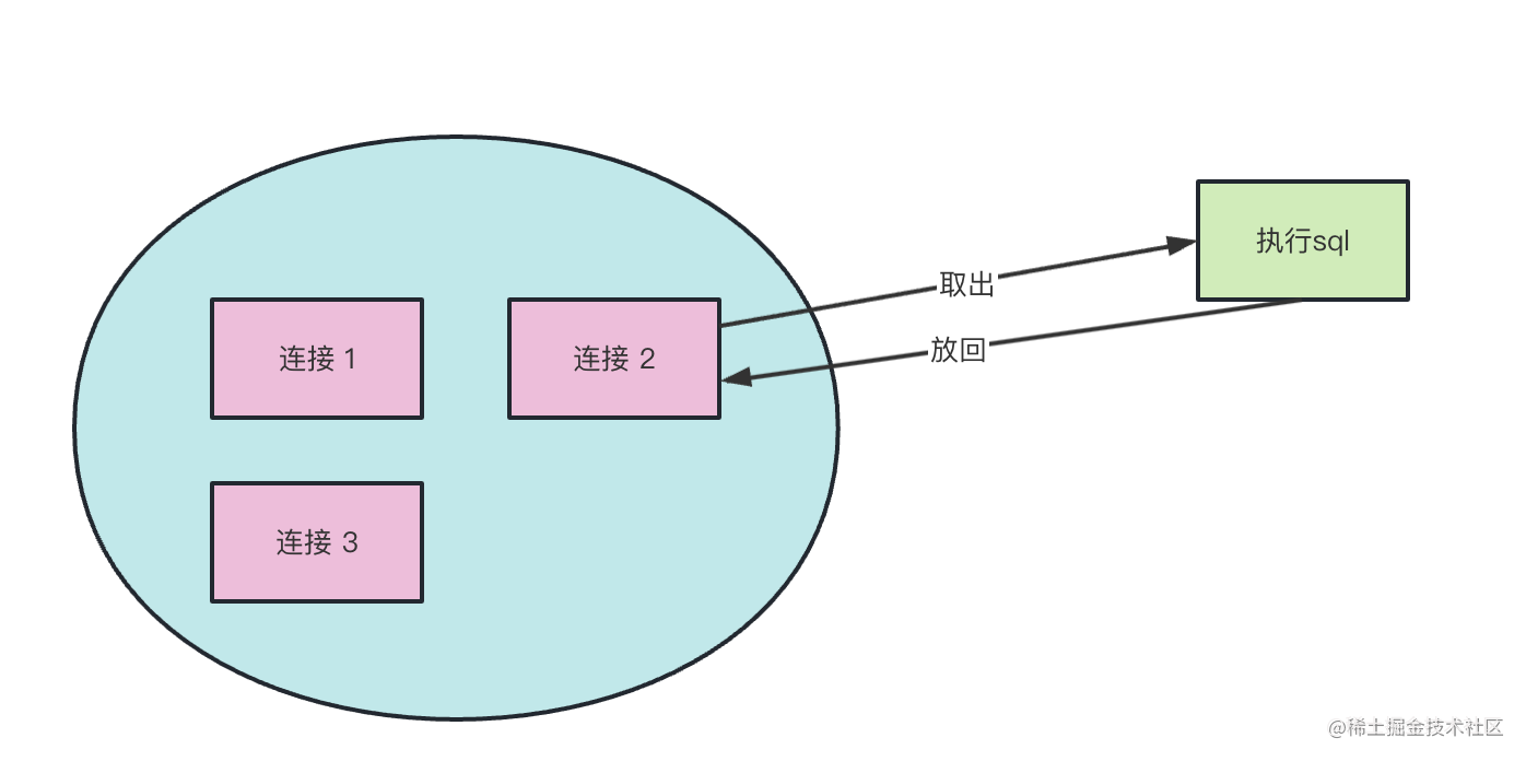 连接池中放着好几个 mysql 的连接对象,用的时候取出来执行 sql,用完之后放回去,不需要断开连接。