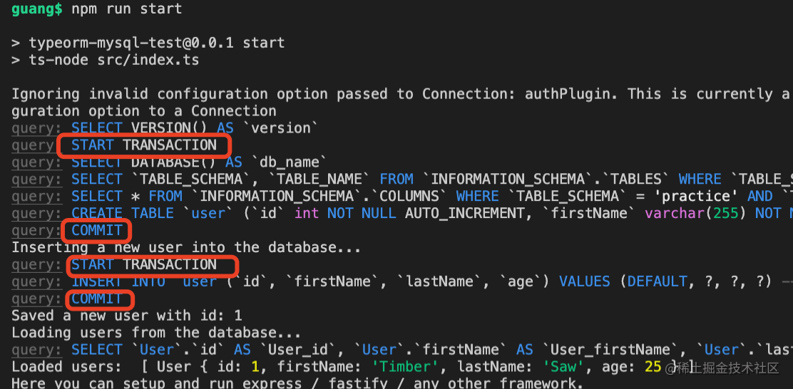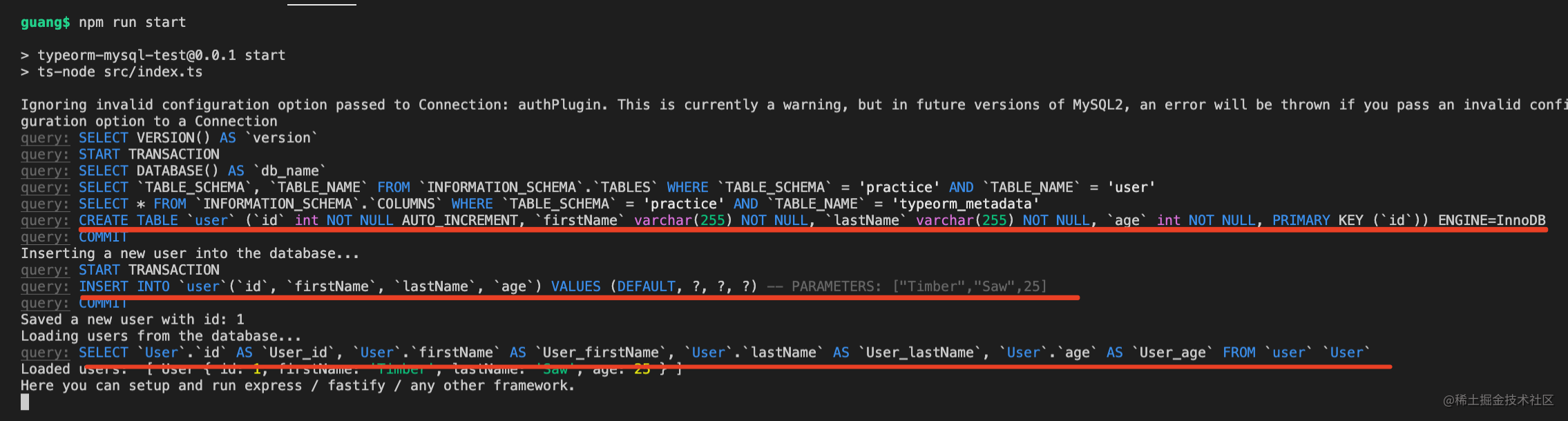 在 index.ts 里创建了一个 User 的对象,调用 save 方法保存这个对象,通过 find 方法查询这个对象:
