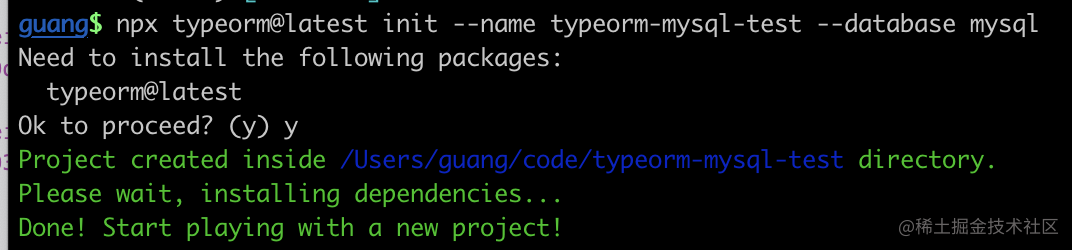 通过 typeorm 的 init 命令创建一个项目, –name 指定项目名,–database 指定连接的数据库。